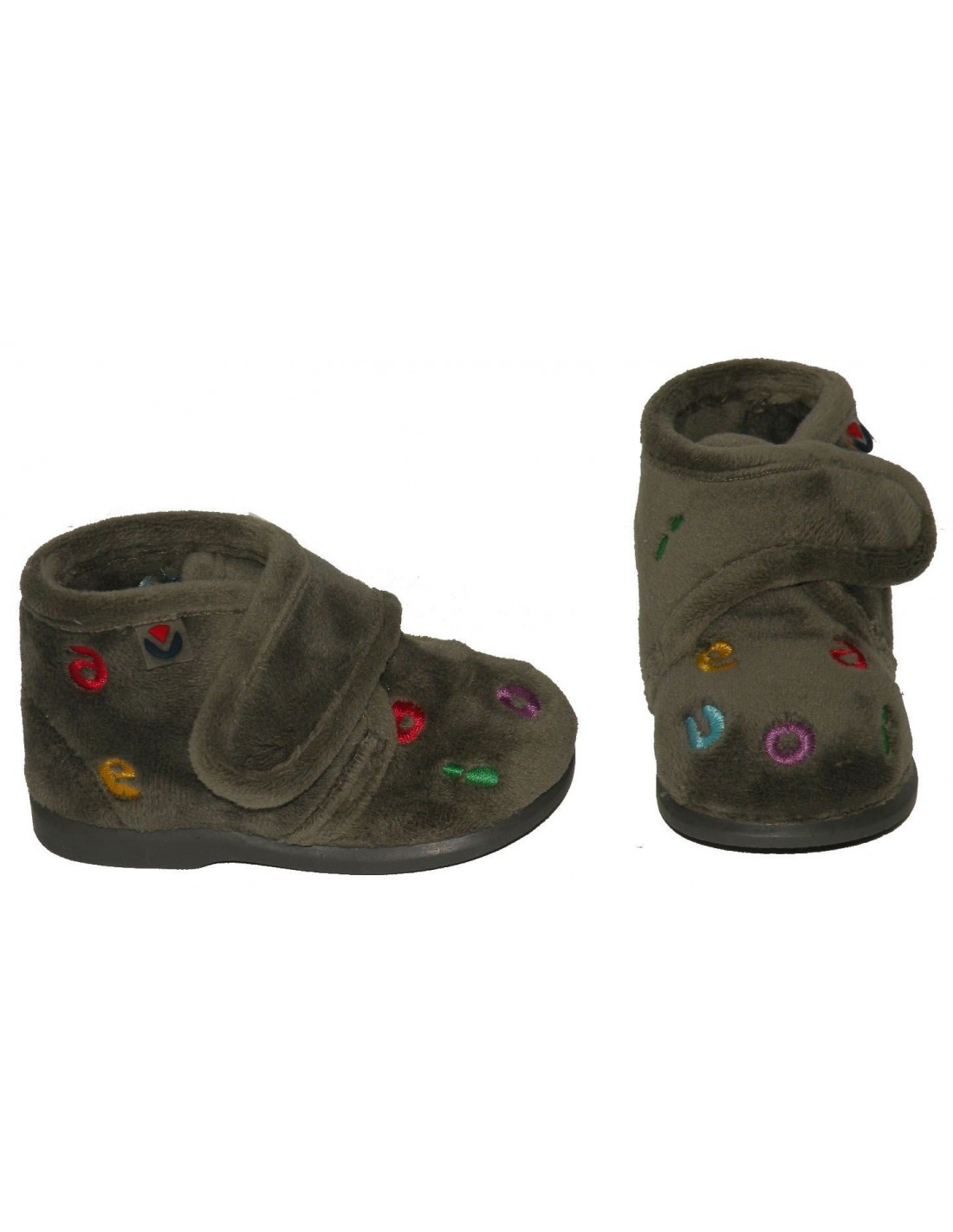 Zapatilla de terciopelo de color gris con bordado de letras multicolor, cierre de velcro ajustable y suela de goma antideslizante.