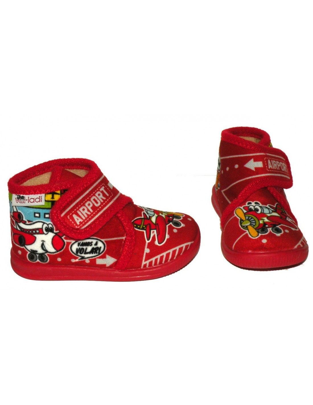 Zapatilla textil de color rojo estampado, forrada en su parte interior, con cierre de 1 velcro ajustable y suela de goma antideslizante.