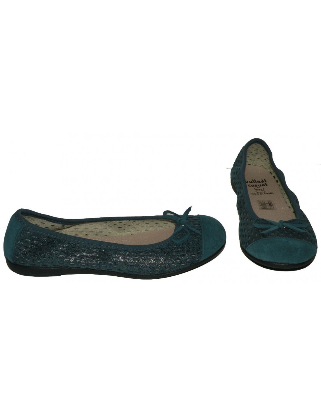 Manoletina en piel serraje troquelada, de color azul, planta interior de piel, piso de goma antideslizante.