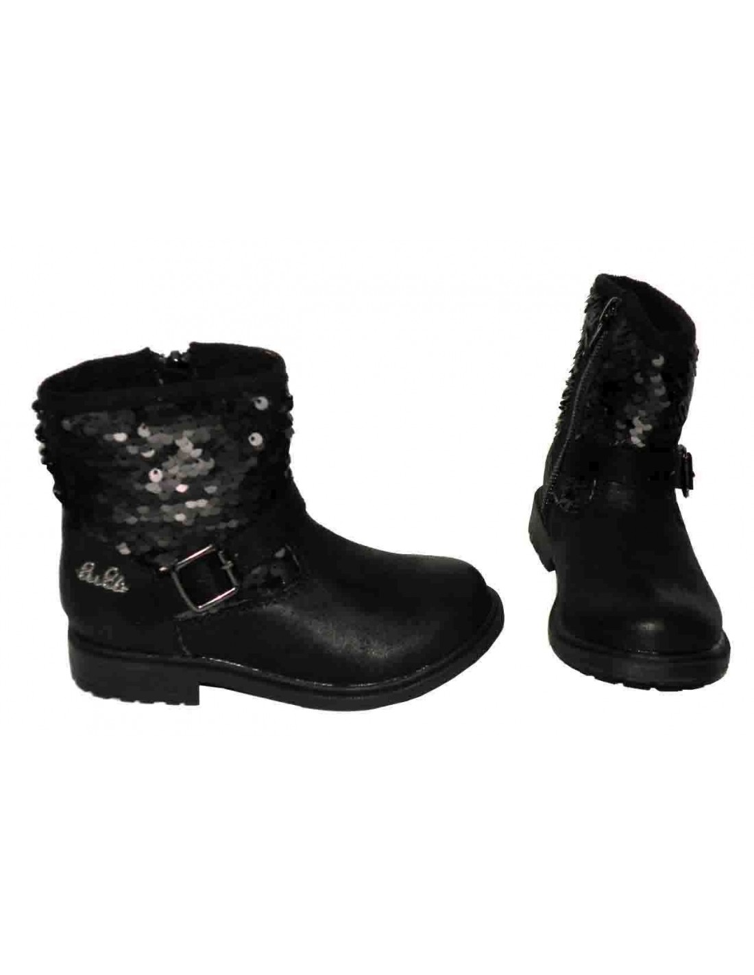 Botín en sintético de color negro con hebilla de adorno y caña de lentejuelas, cierre de cremallera, plantilla interior de piel y piso de goma antideslizante.