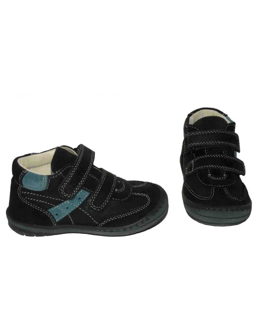 Zapato abotinado en piel serraje de color marino, cierre de 2 velcros, interior de piel, puntera reforzada de goma y piso de goma antideslizante.
