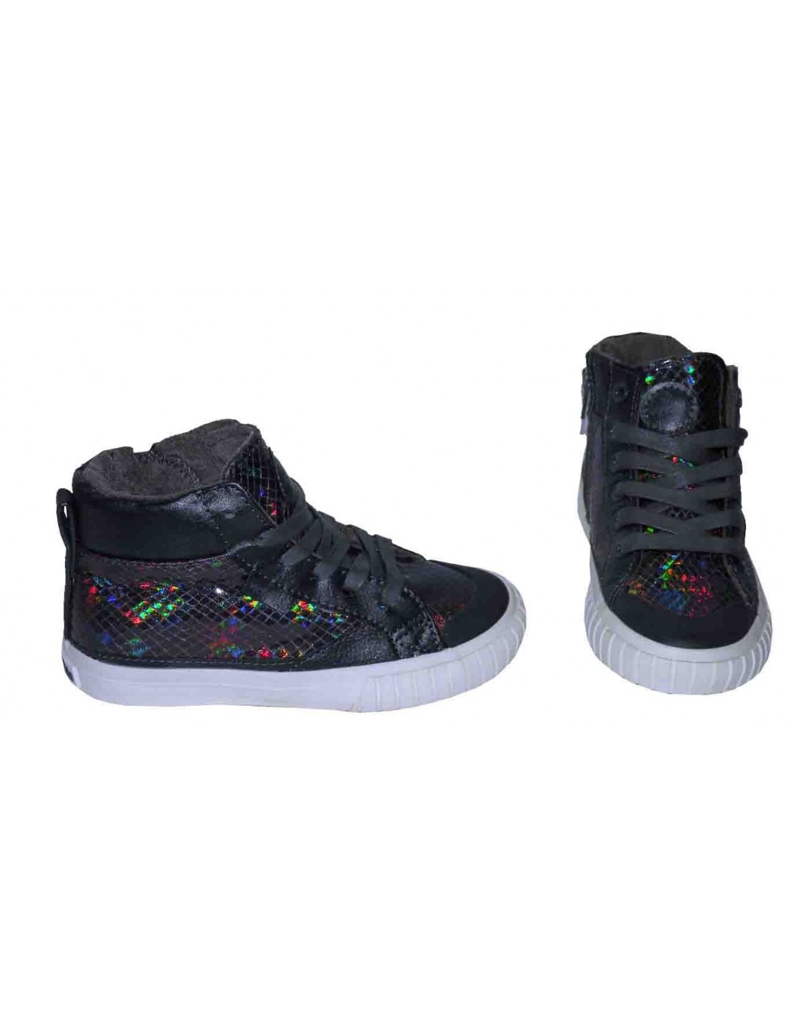 Zapato deportivo abotinado en sintético de color gris, con tornasol metalizado, cierre de cordón y cremallera lateral, puntera reforzada de goma y piso de goma antideslizante.