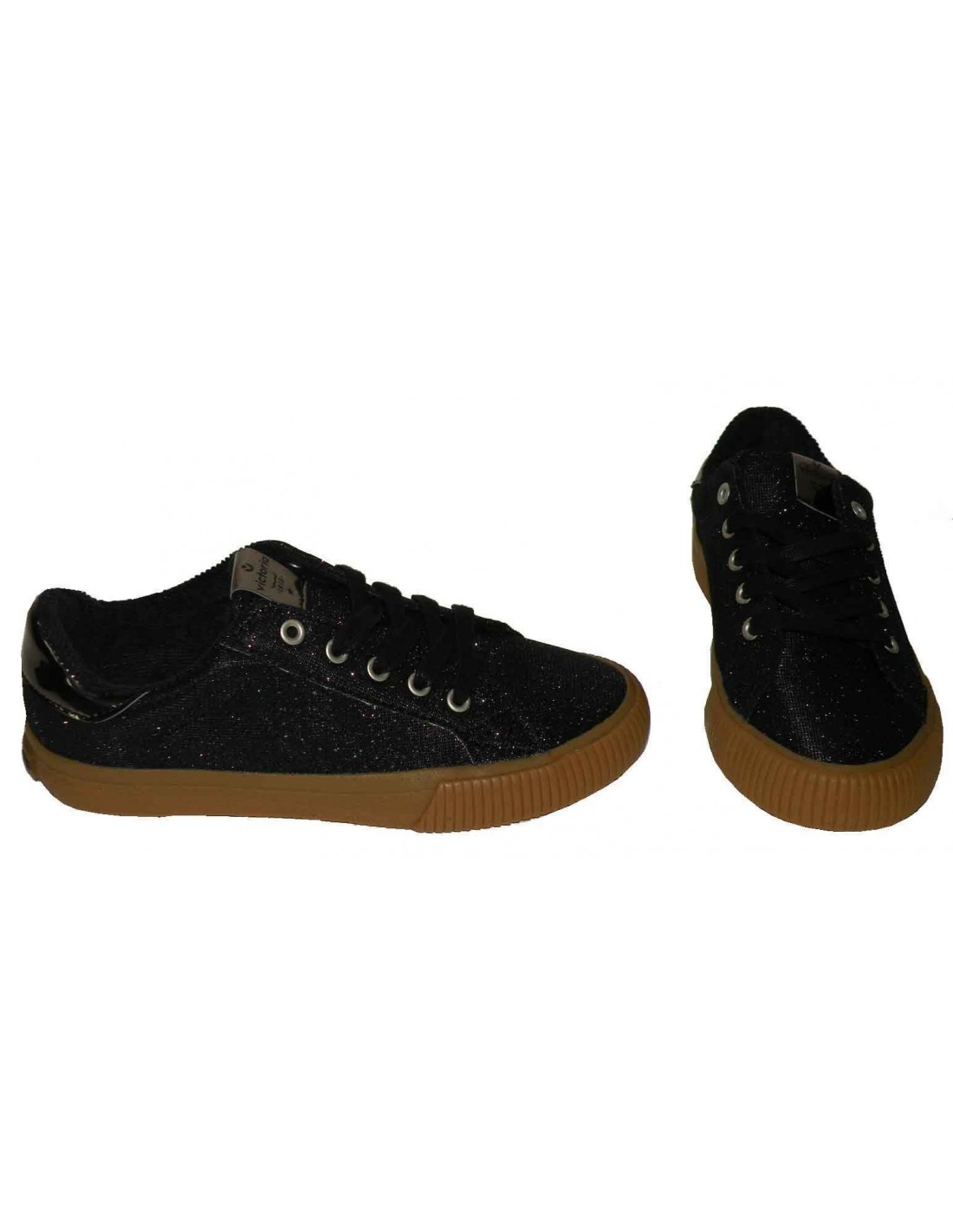 Zapato deportivo en textil de color negro brillante, cierre de cordón y piso de goma antideslizante.