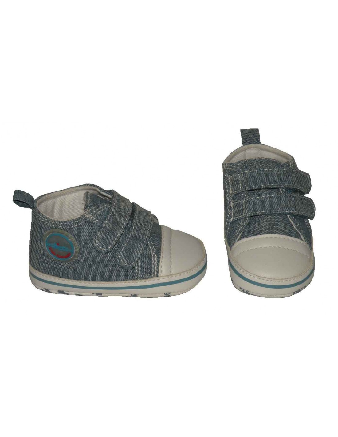 Peuque de bebé en textil de color azul jeans, cierre de 2 velcros y suela blanda.
