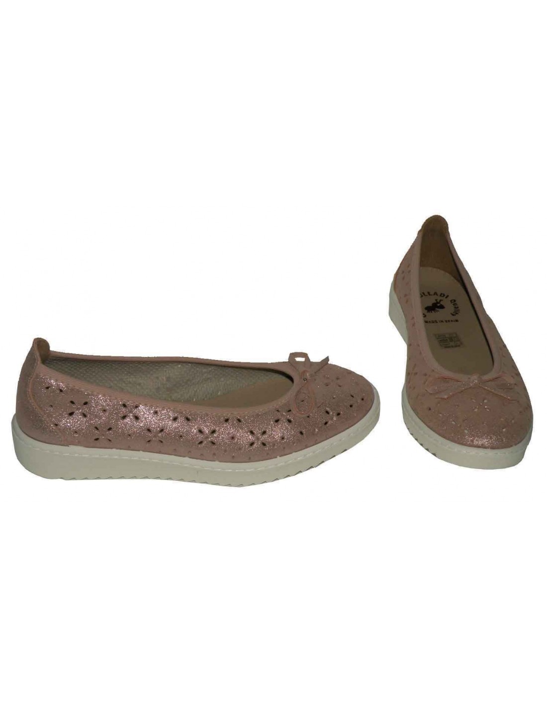 Manoletina troquelada en piel de color nude, piso con pequeña cuña de goma antideslizante.