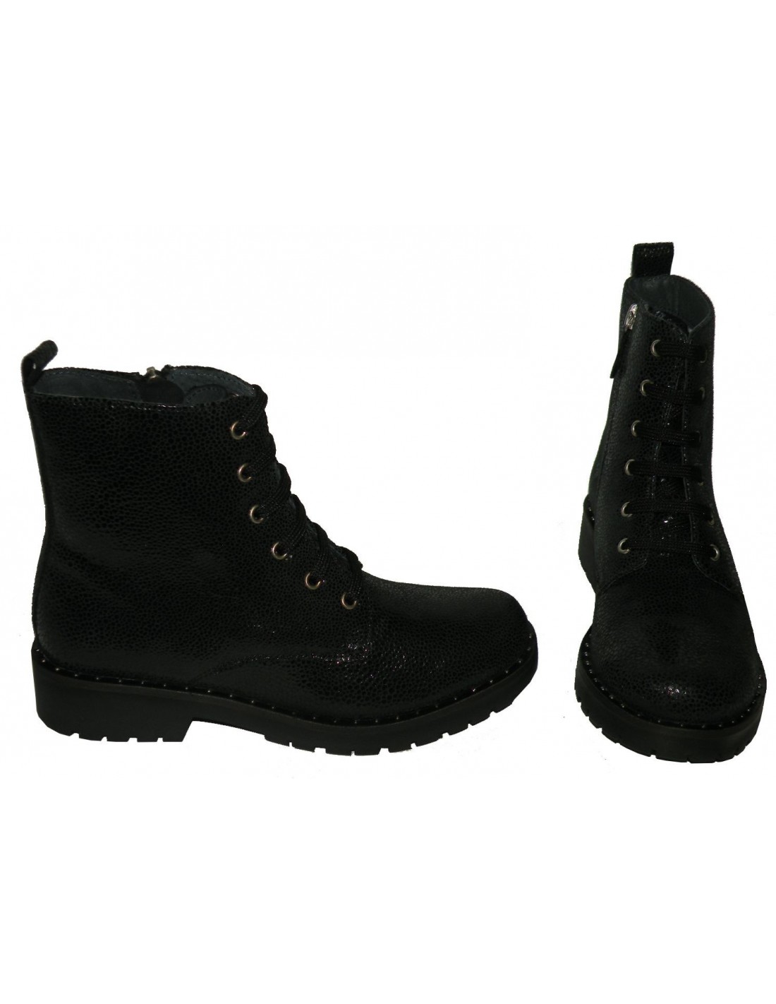Botín de niña en piel de color negro con ligero toque satinado, con cordón y cremallera lateral, piso de goma antideslizante.
