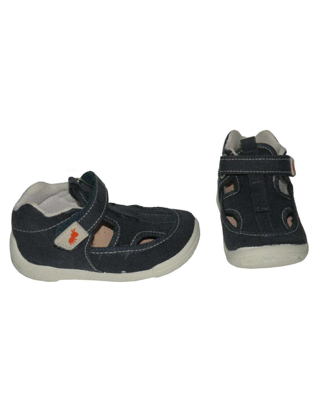 Zapatilla de lona en color jeans, cierre de velcro, plantilla interior de piel y piso fllexible de goma antideslizante.