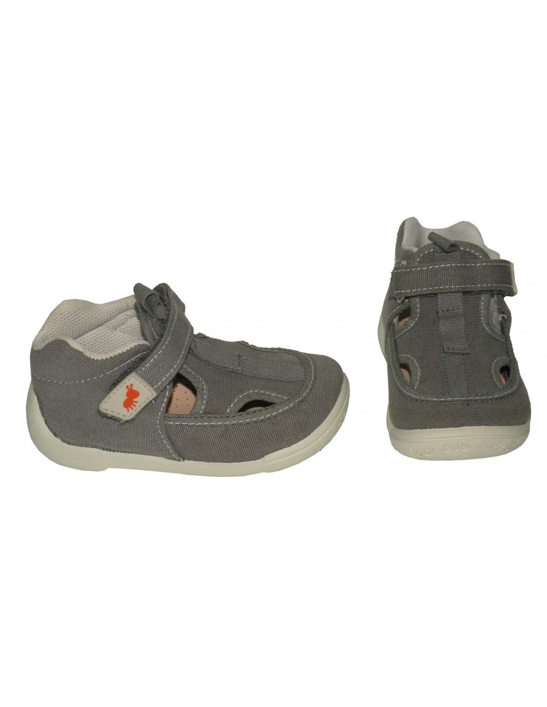 Zapatilla de lona en color jeans, con cierre de velcro, plantilla interior de piel y piso flexible de goma antideslizante.
