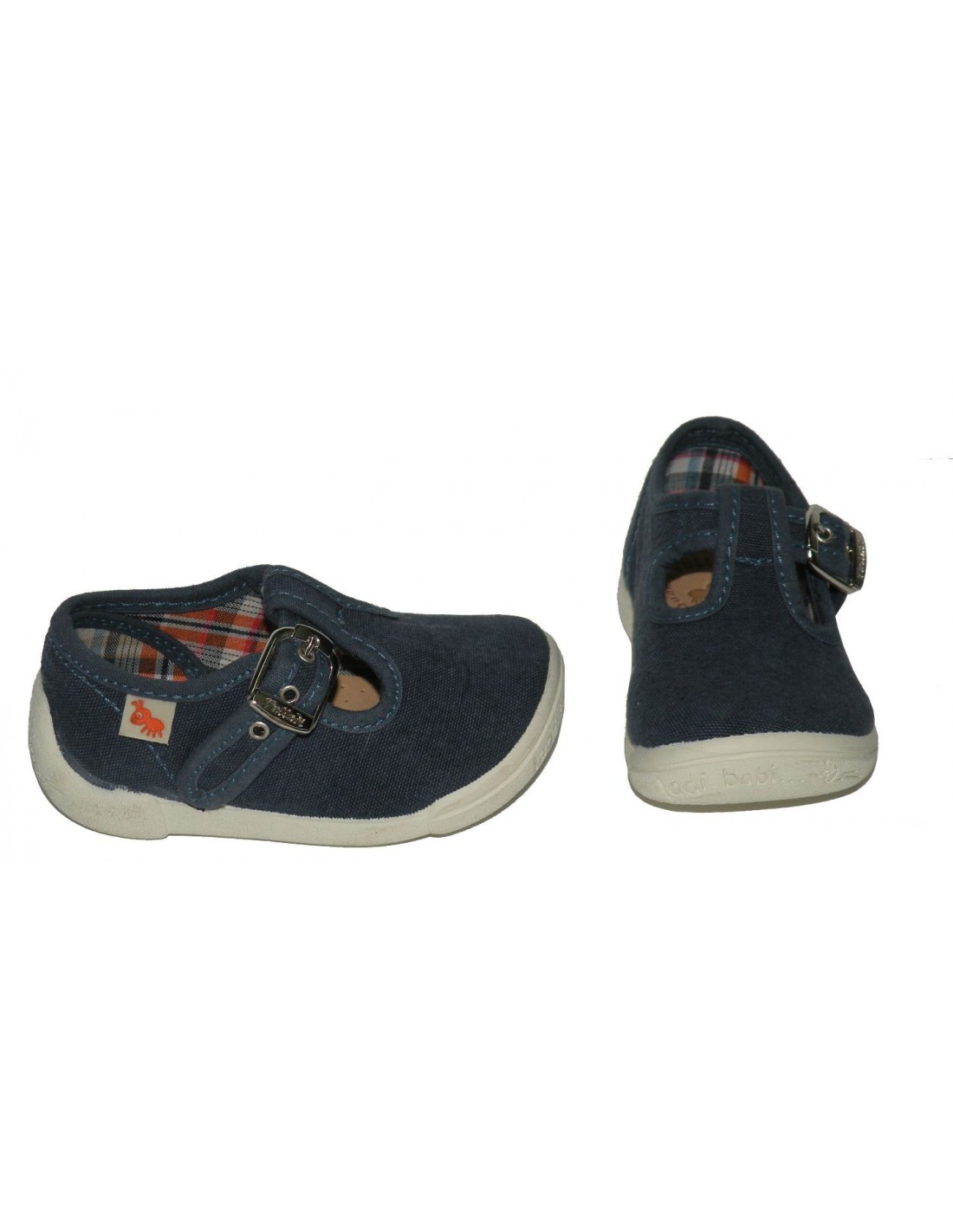 Zapatilla de lona en color jeans, cierre de hebilla, plantilla interior de piel y piso flexible de goma antideslizante.