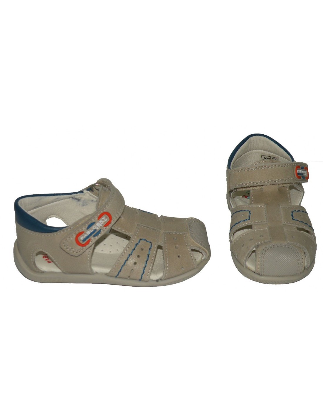 Sandalia en piel de color beig con detalles en azul, talonera y puntera cerrada, planta acolchada en intech absorbente y transpirable, velcro y piso de goma antideslizante.