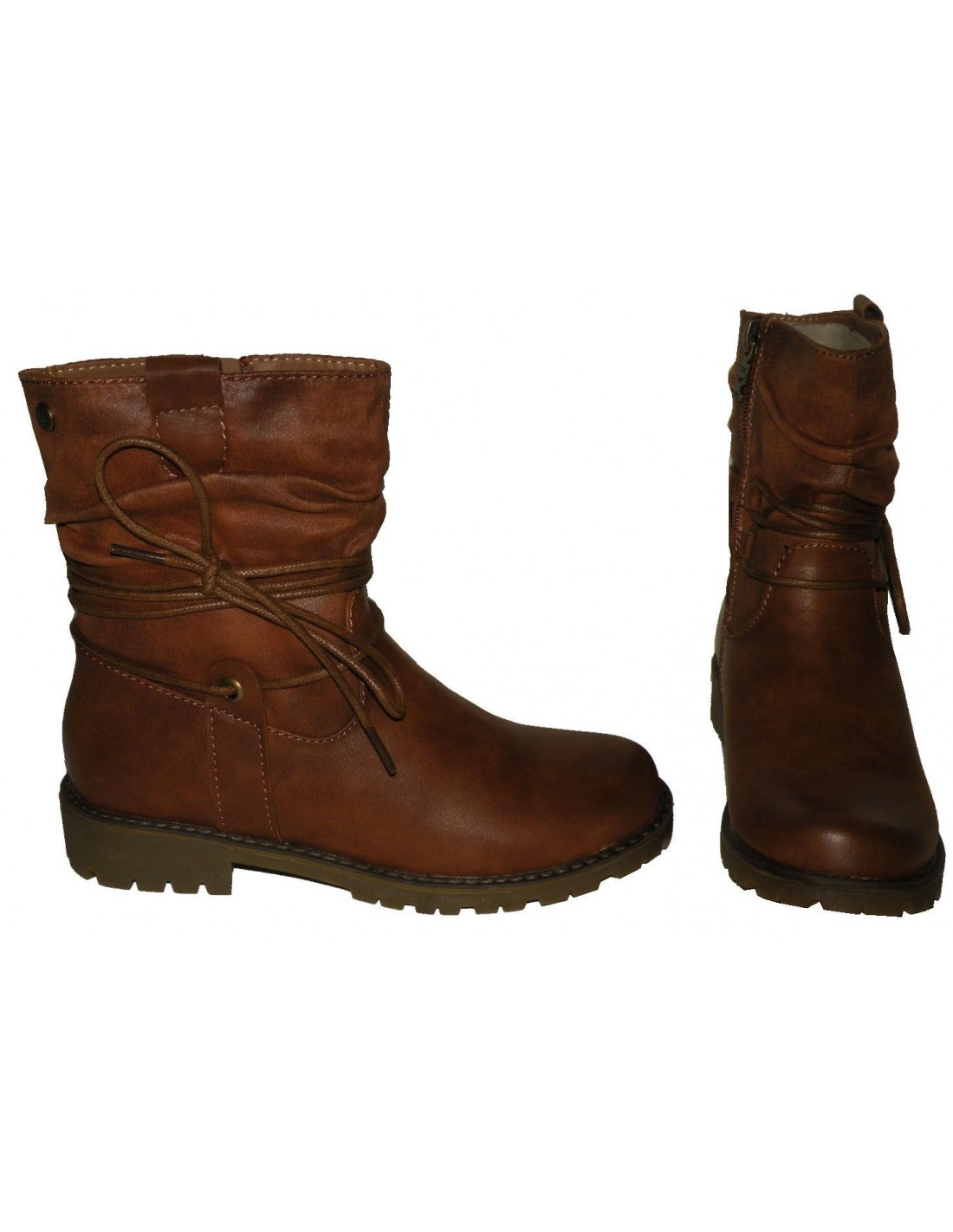 Botín en sintético de color cuero con detalle de cordón alrededor, cremallera y piso de goma antideslizante.