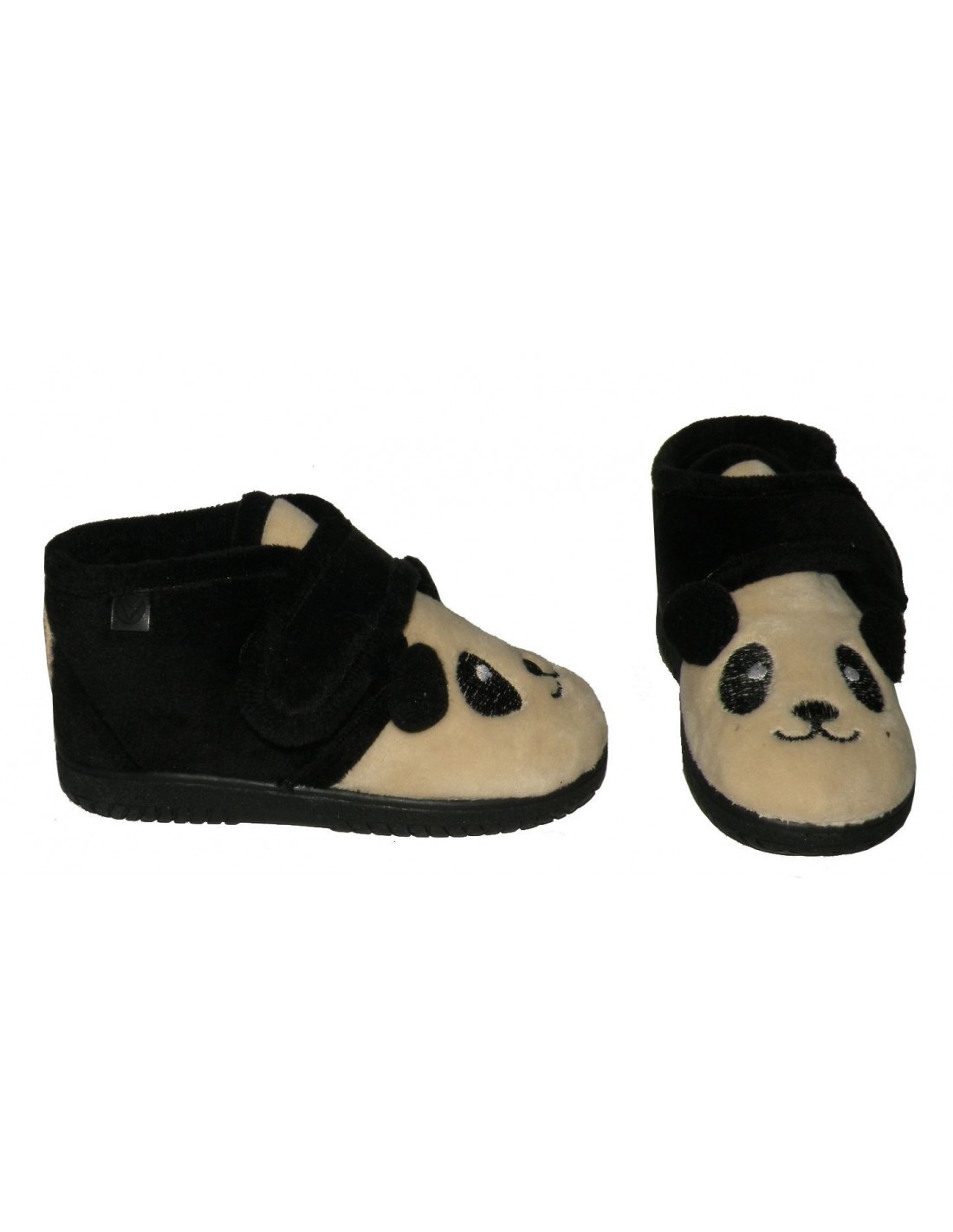 Zapatilla de casa abotinada en textil de color negro/blanco, con cara de oso panda, velcro y piso de goma antideslizante.
