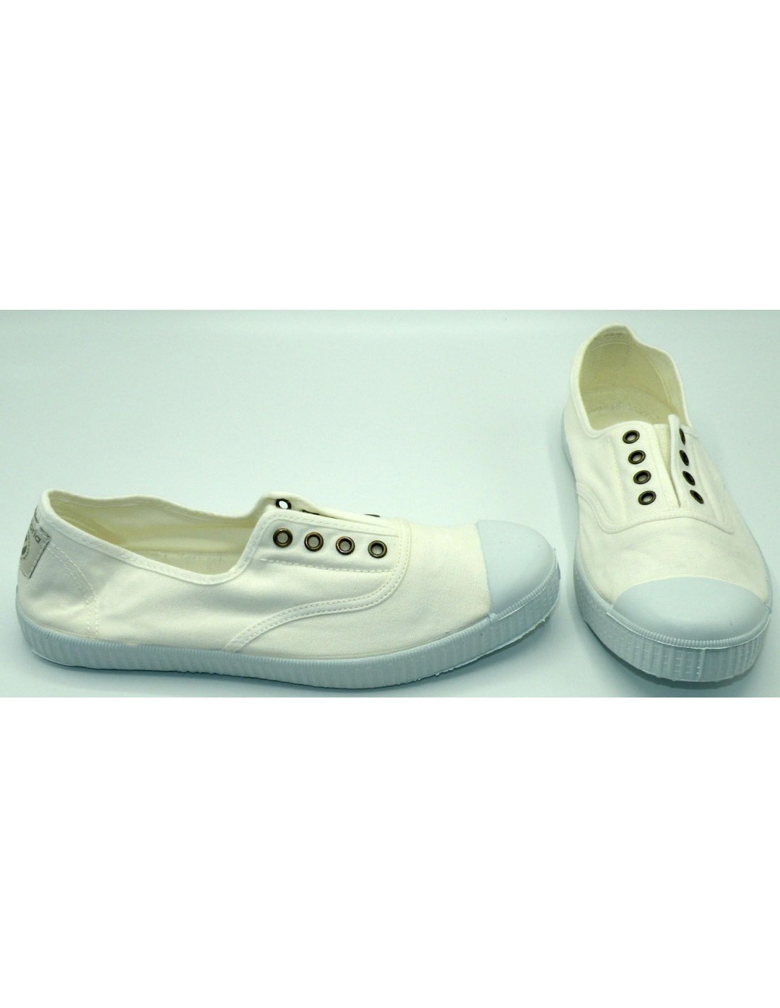 Zapatilla de lona en color blanco, elástico en el empeine, puntera y piso de goma antideslizante.