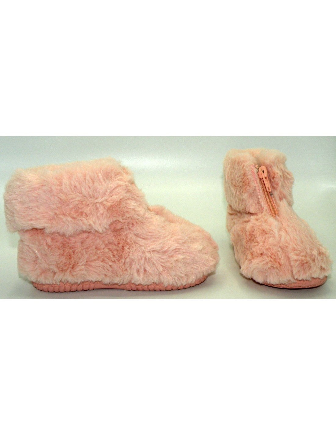 Zapatilla en textil peluche de color rosa, cremallera central y piso de goma antideslizante.