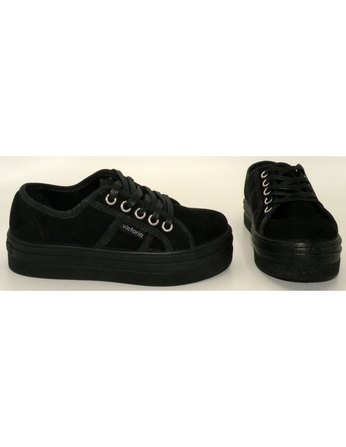 Zapato deportivo en antelina de color negro, cierre de cordón y cuña de 3cm de goma antideslizante.