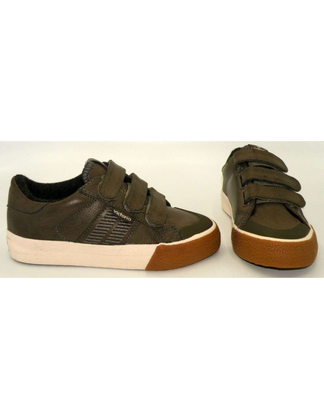 Zapato deportivo en sintético de color taupe, cierre de 3 velcros, puntera reforzada y piso de goma antideslizante.