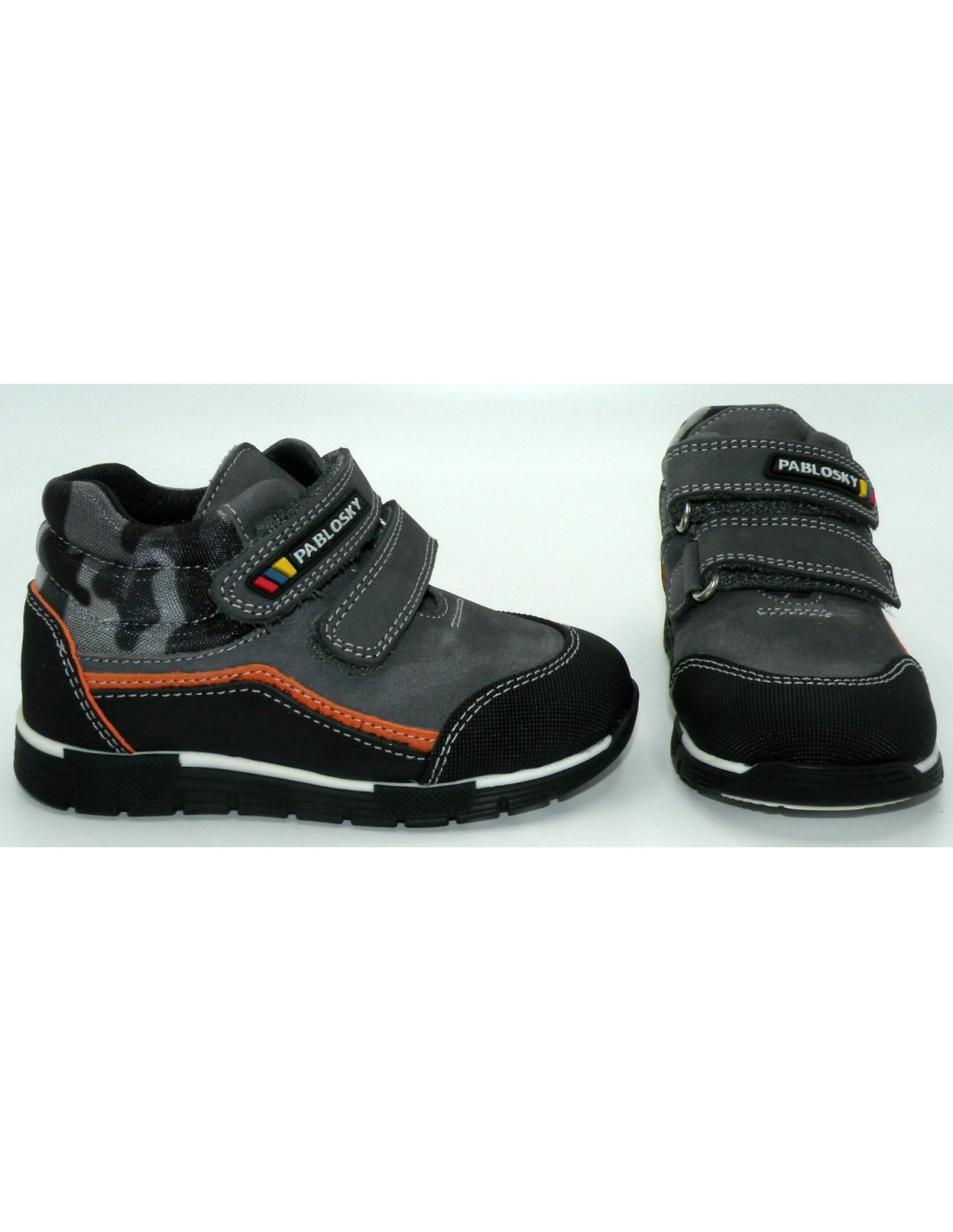 Zapato abotinado en piel de color gris con print tipo camuflaje, 2 velcros, puntera y piso de goma antideslizante.