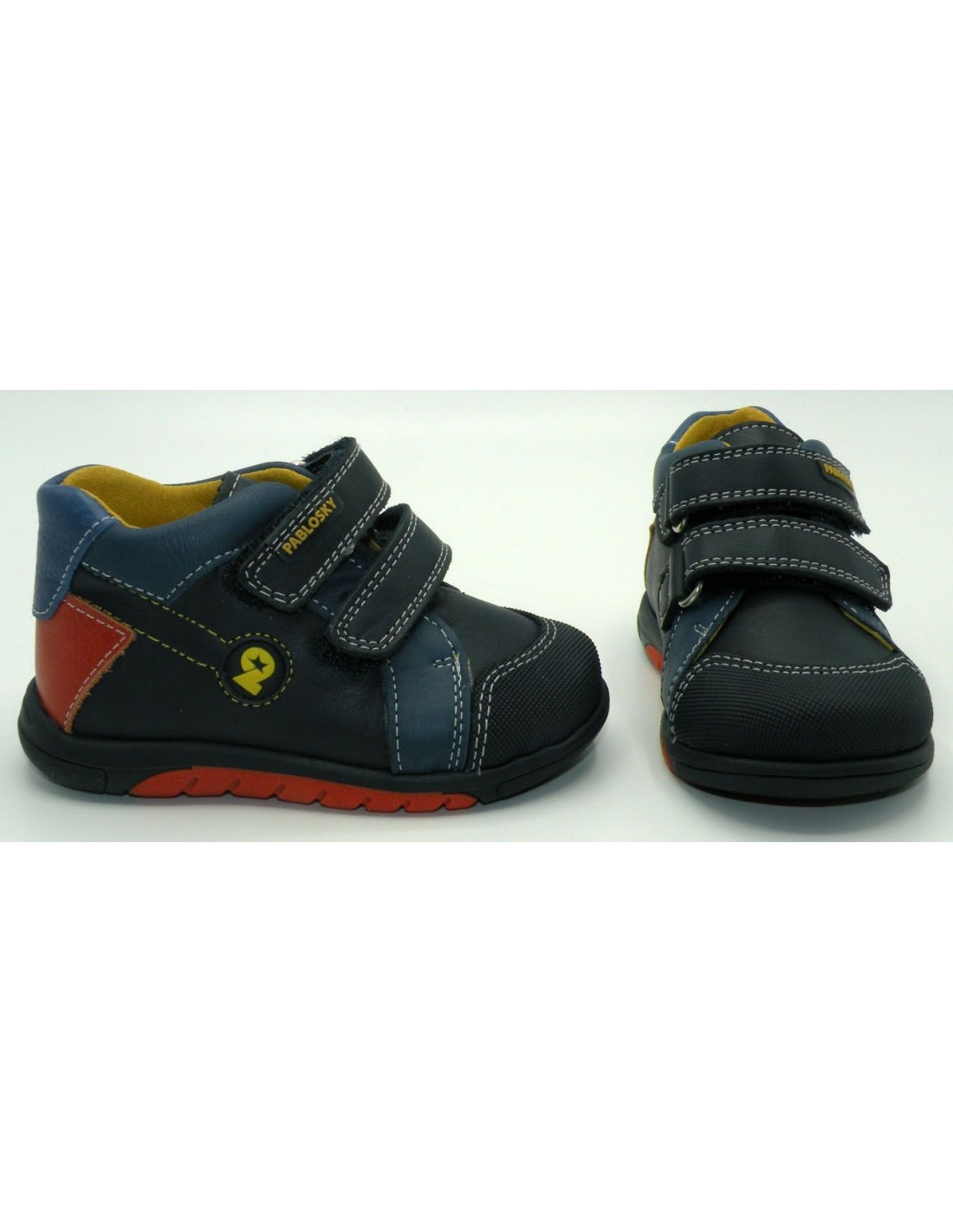 Zapato abotinado en piel de color marino, 2 velcros, puntera reforzada y piso flexible de goma antideslizante.