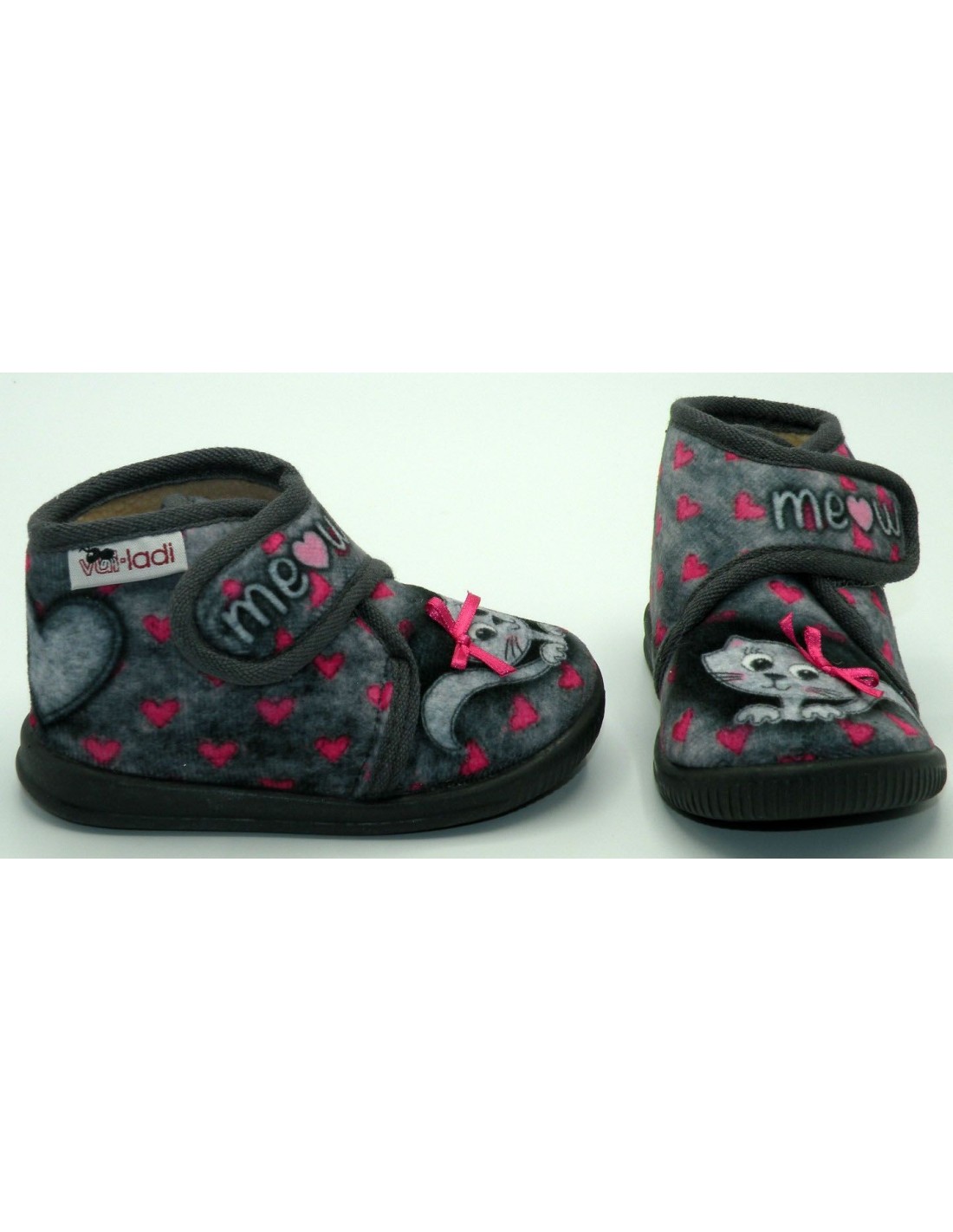 Zapatillas de material textil/terciopelo de color gris estampado con gato, con cierre de velcro ajustable y suela antideslizante.
