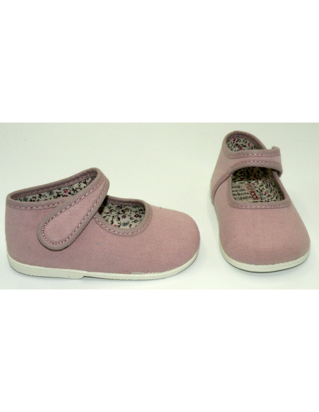 Merceditas de lona en color rosa palo, velcro y piso de goma antideslizante.