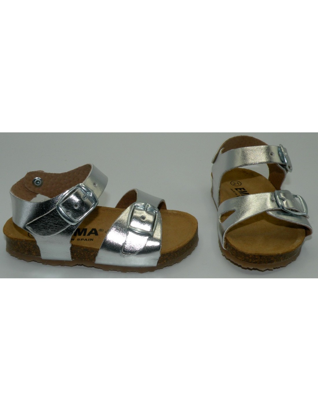 Sandalia bio en sintético laminado de color plata, forro de piel, planta anatómica de piel, hebillas y piso de goma antideslizante.