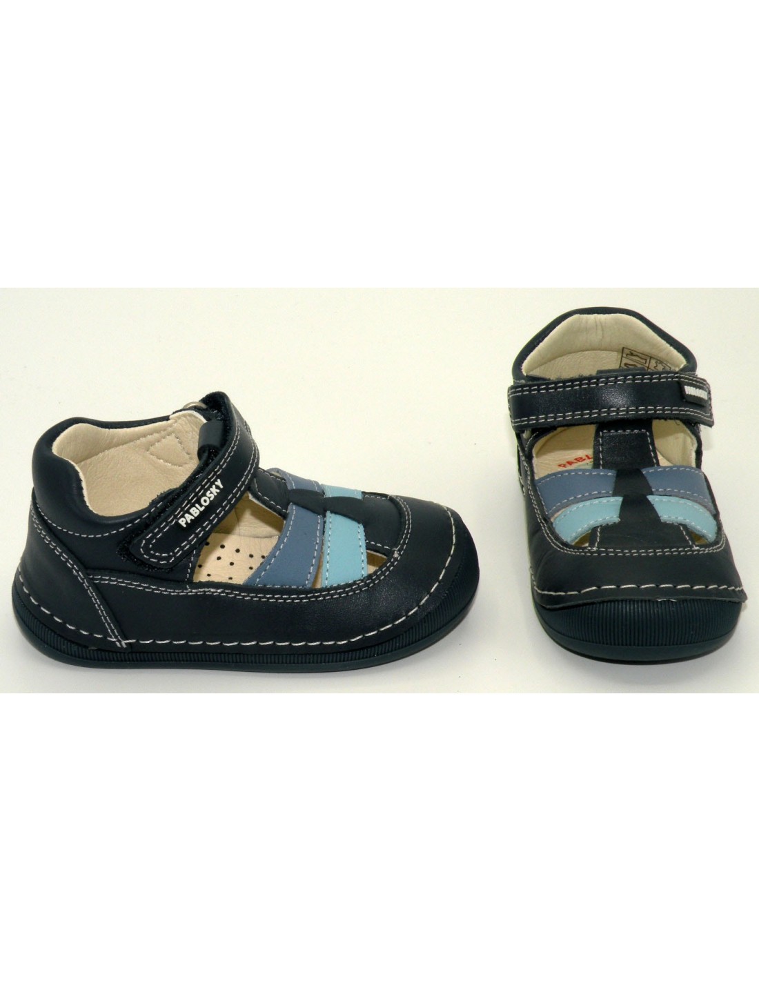 Zapato de primavera en piel de color marino-azul, velcro, puntera de goma y piso flexible de goma antideslizante.