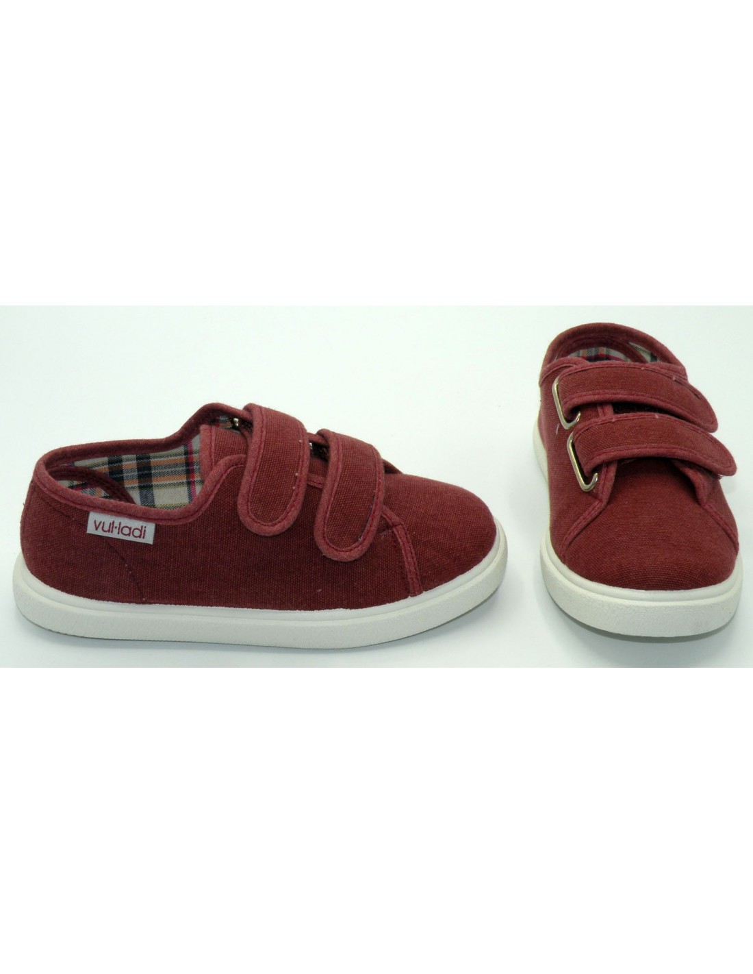 Zapatilla de lona de color burdeos, con cierre de 2 velcros ajustables y suela de goma antideslizante.