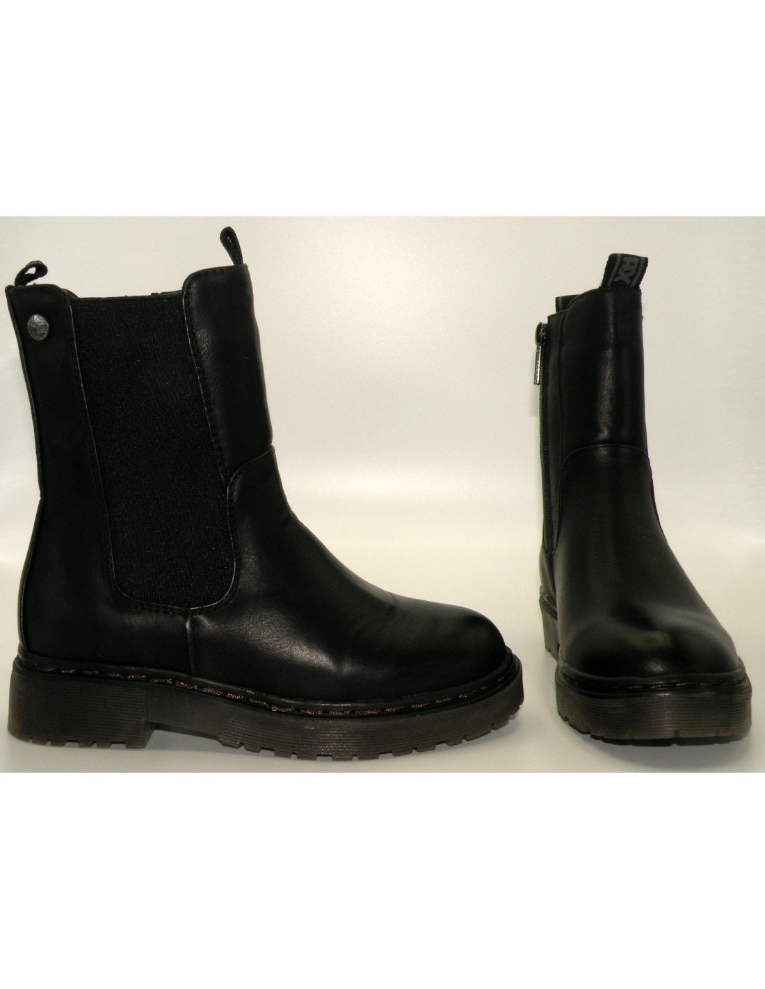 Bota en sintético de color negro con goma elástica y cremallera, piso de goma antideslizante.
