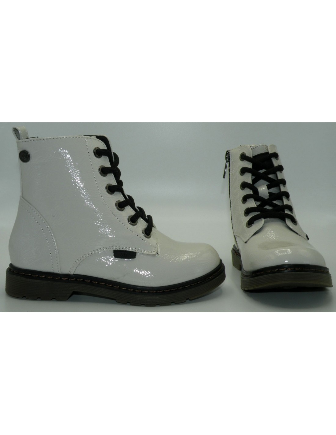 Botín tipo MARTENS en sintético acharolado de color blanco, con cordones y cremallera, piso de goma antideslizante.