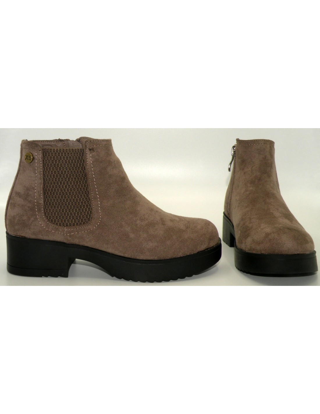 Botín en microfibra de color camel, con elástico y cremallera, tacón de 2,5cm y piso de goma antideslizante.