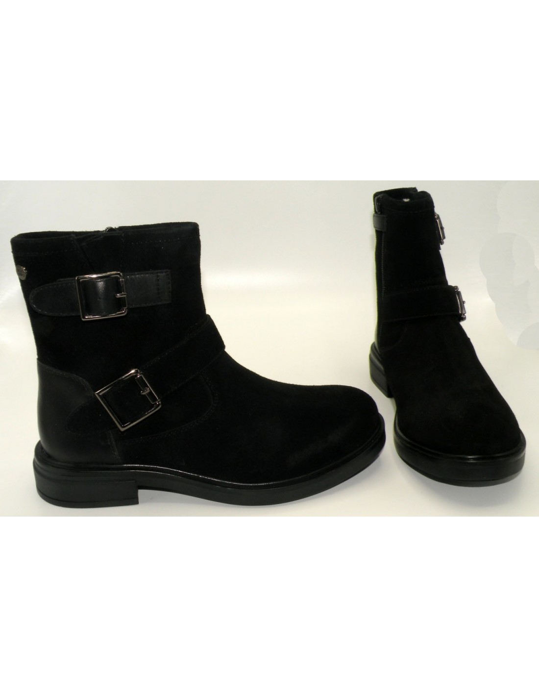 Botín en piel serraje de color negro, con hebillas laterales y cremallera, piso de goma antideslizante.