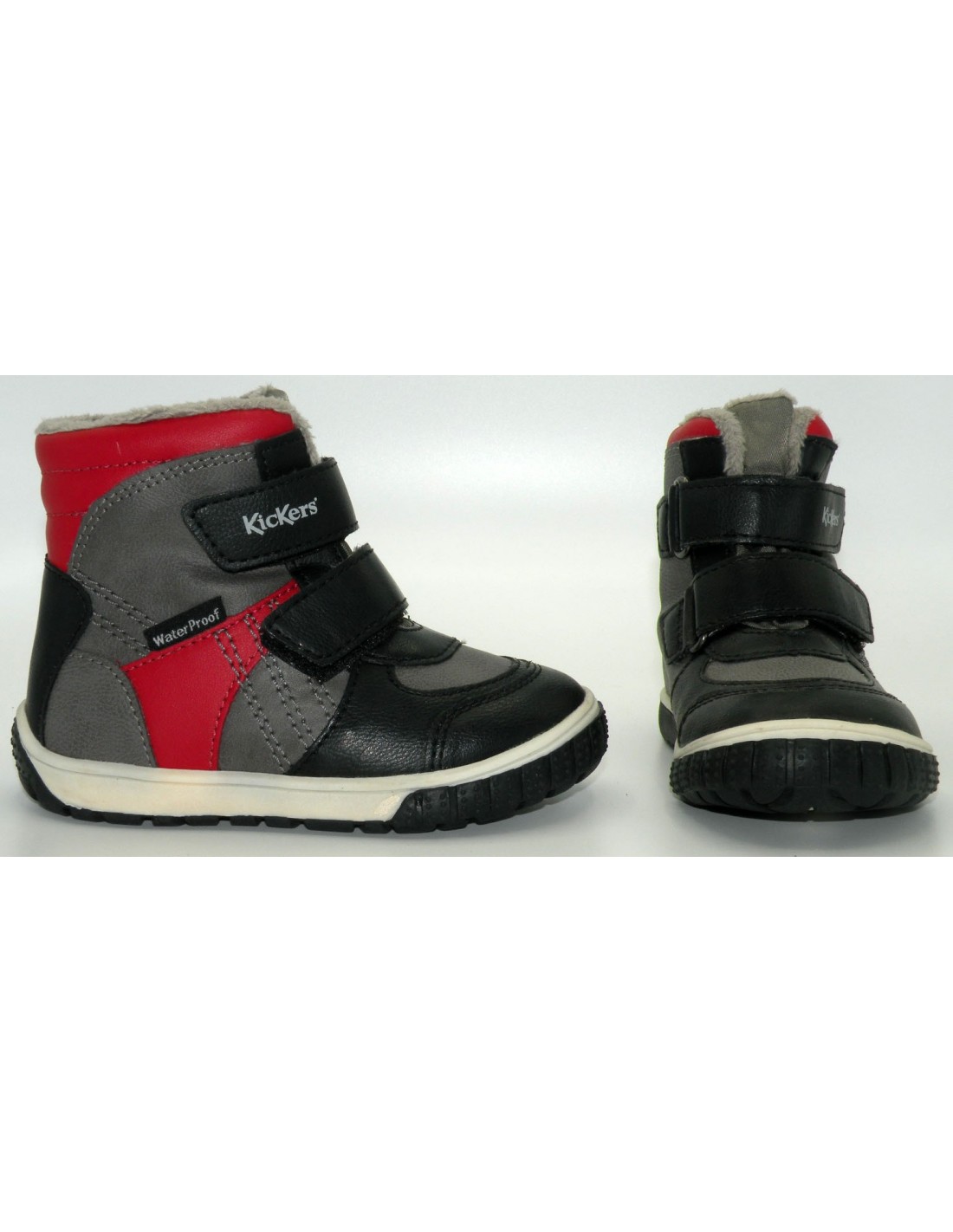Botín de caña media en sintético gris/negro/rojo, con WATERPROOF, 2 velcros, forro interior peludito y piso de goma antideslizante.