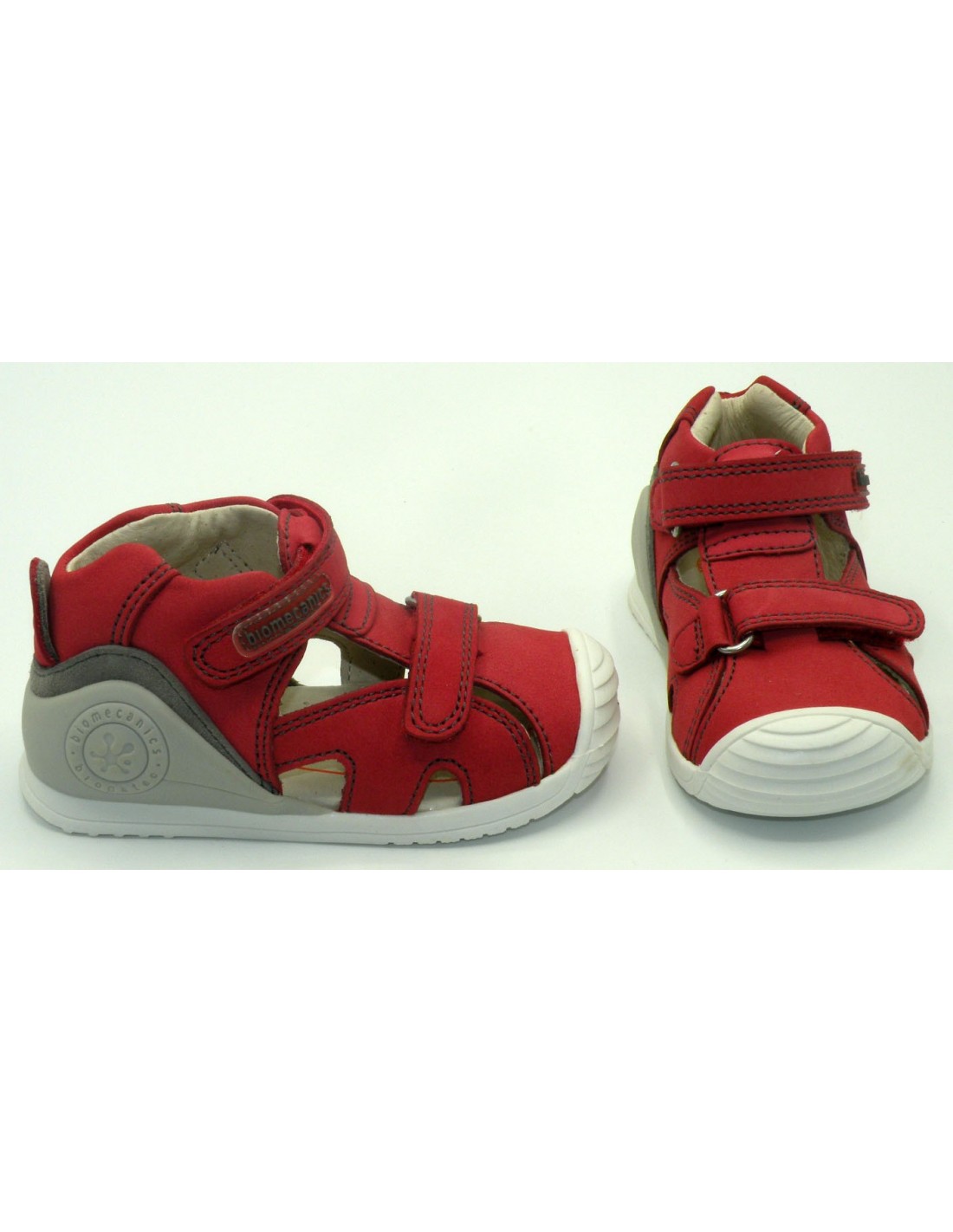 Sandalia de primeros pasos en piel nobuck de color rojo, puntera y talonera cerrada,2 velcros, plantilla acolchada y piso de goma antideslizante.