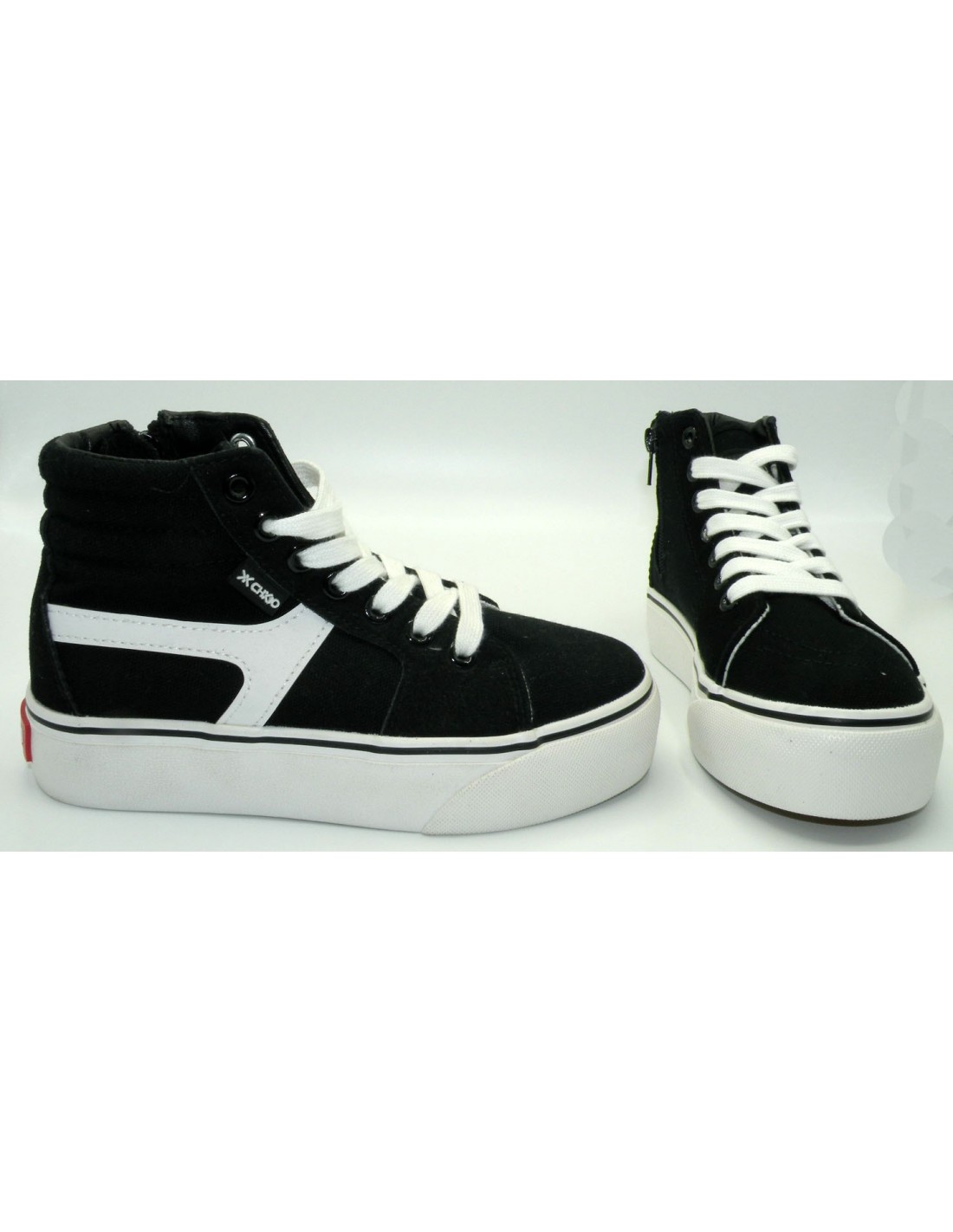 Deportiva abotinada en sintético/textil de color negro con detalle lateral en blanco, con cordones y cremallera, piso de goma antideslizante.