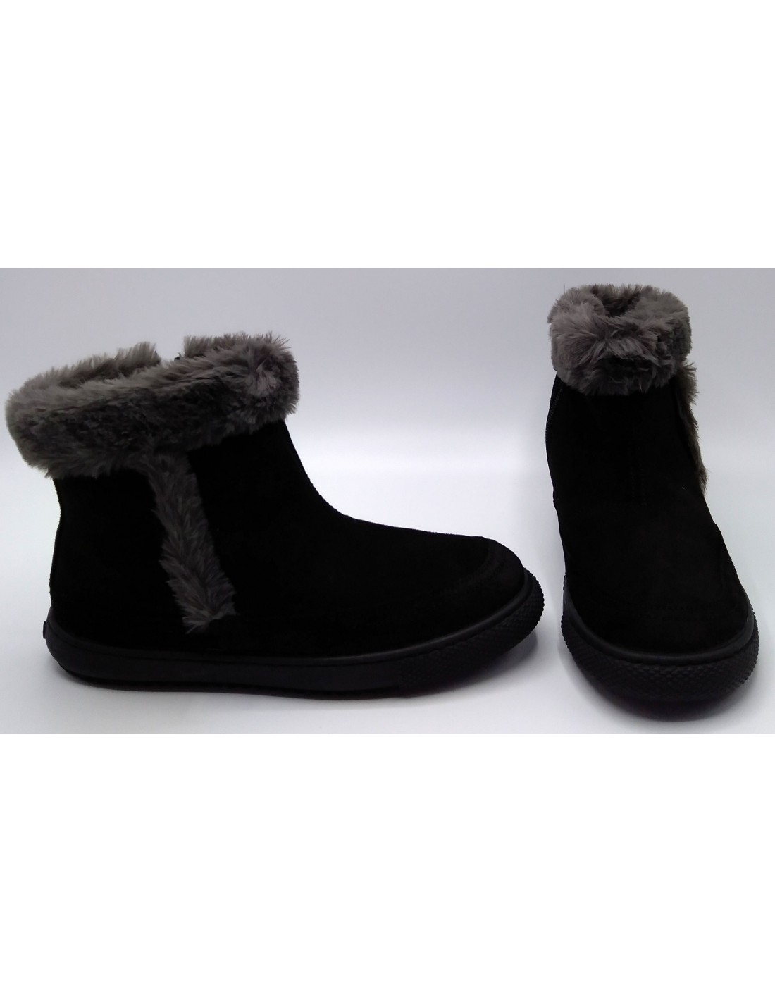 Botín en piel serraje de color negro, con detalle de collar superior y lateral en peluche crudo, cremallera y piso de goma antideslizante.