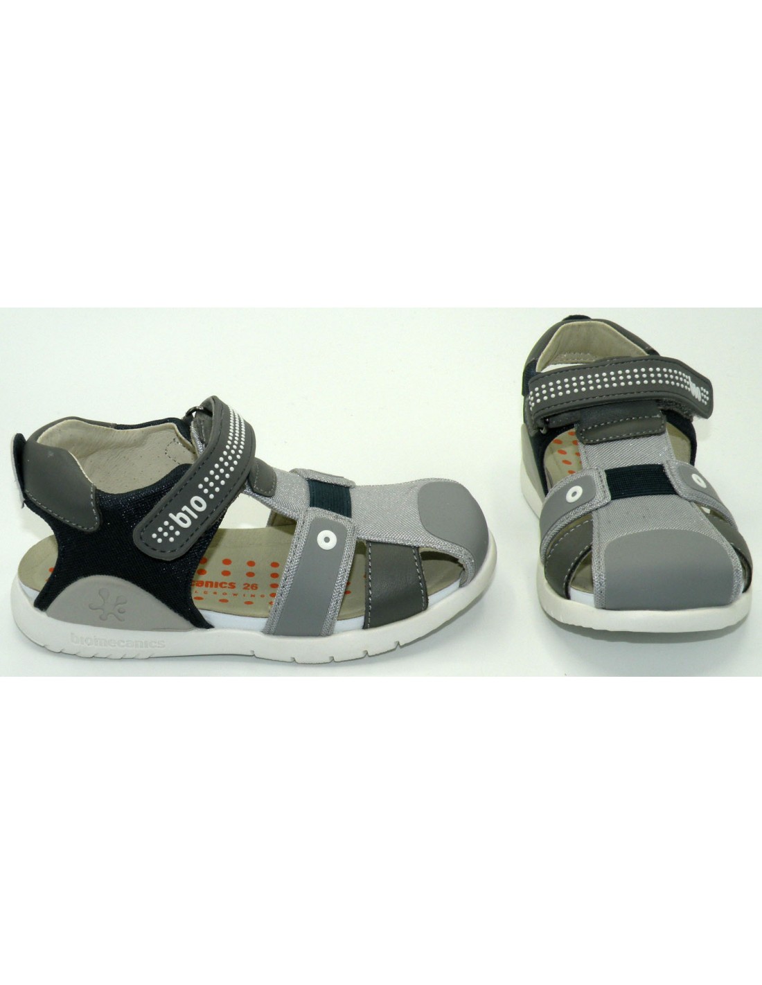Sandalia en piel/textil de tonos gris/azul, puntera cerrada, velcro, planta acolchada de piel y piso de goma antideslizante.