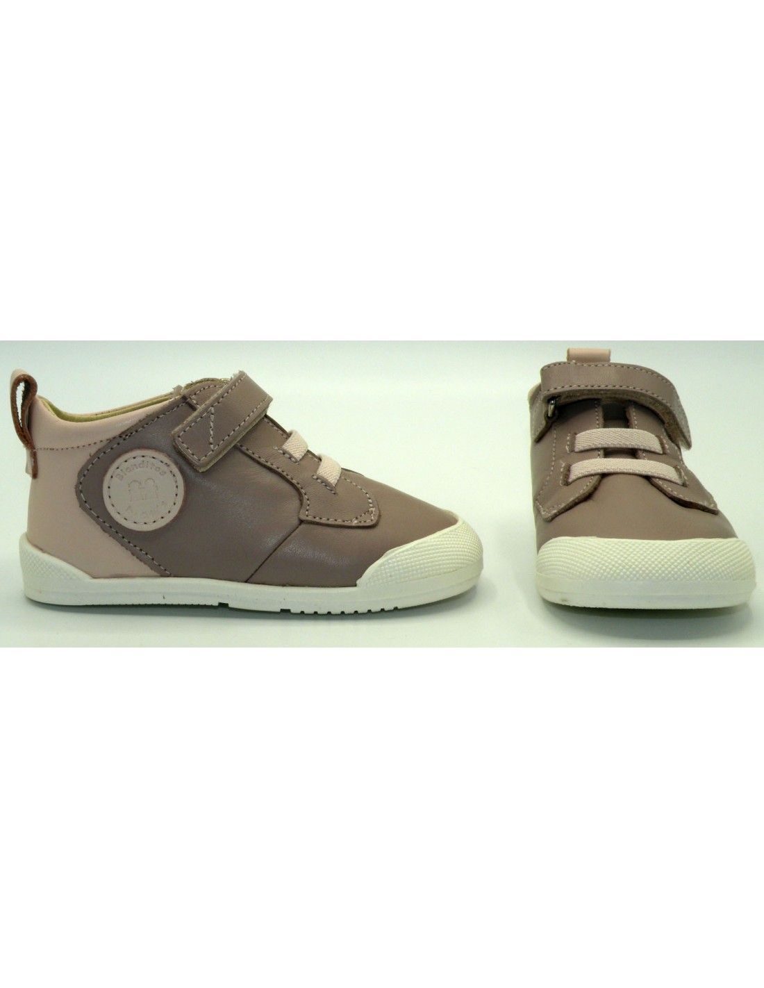 Zapato abotinado respetuoso en piel de color rosa/beige, con cierre de cordón elástico y velcro, con piso flexible de goma antideslizante.