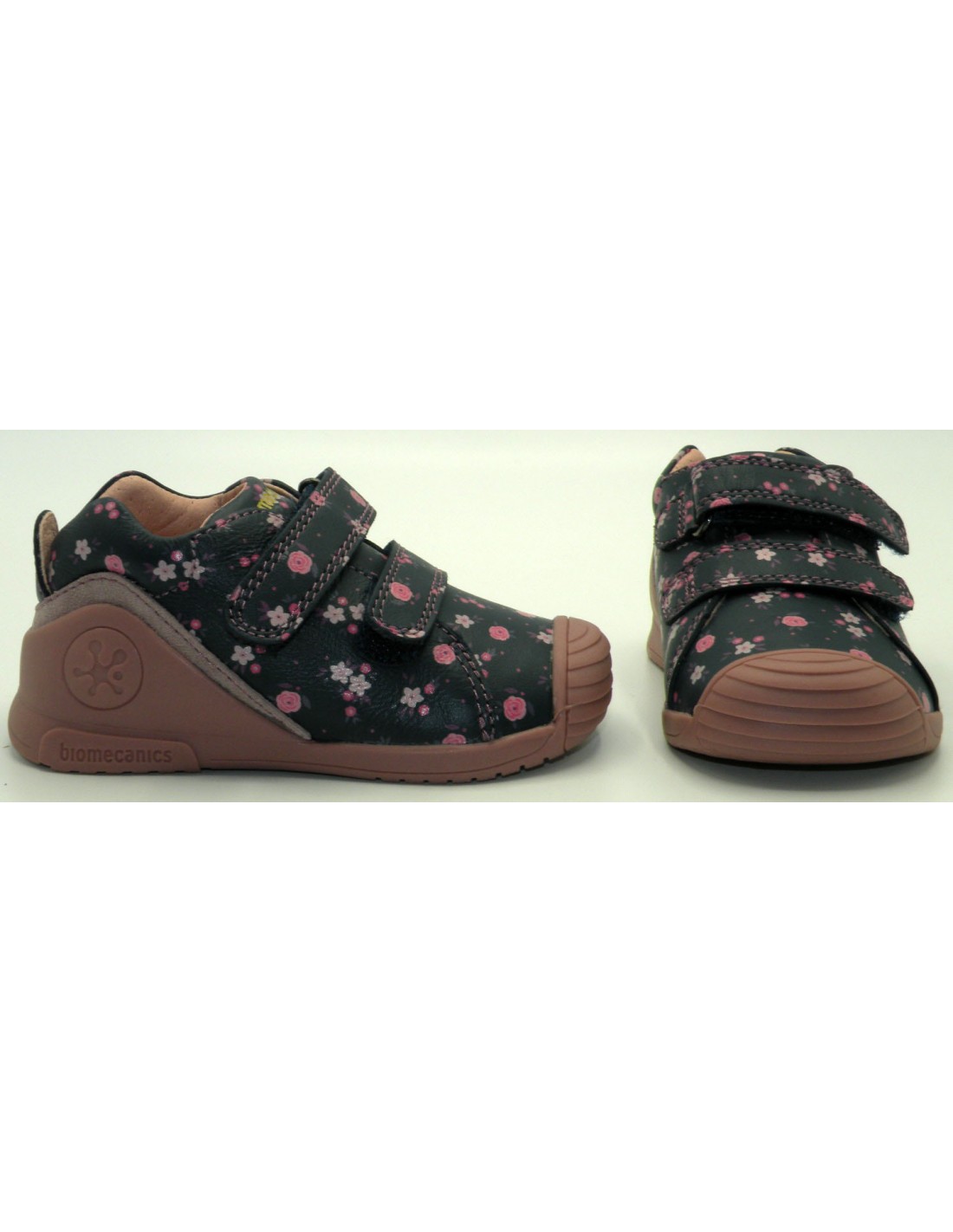 Zapato abotinado en piel de color marino con estampado floral, 2 velcros y piso de goma antideslizante.