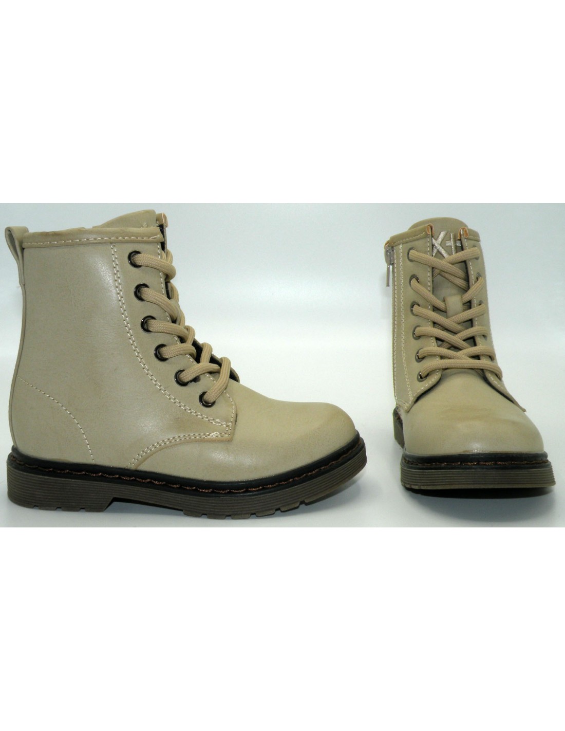 Botín en sintético de color beig, con cordones y cremallera, piso de goma antideslizante.