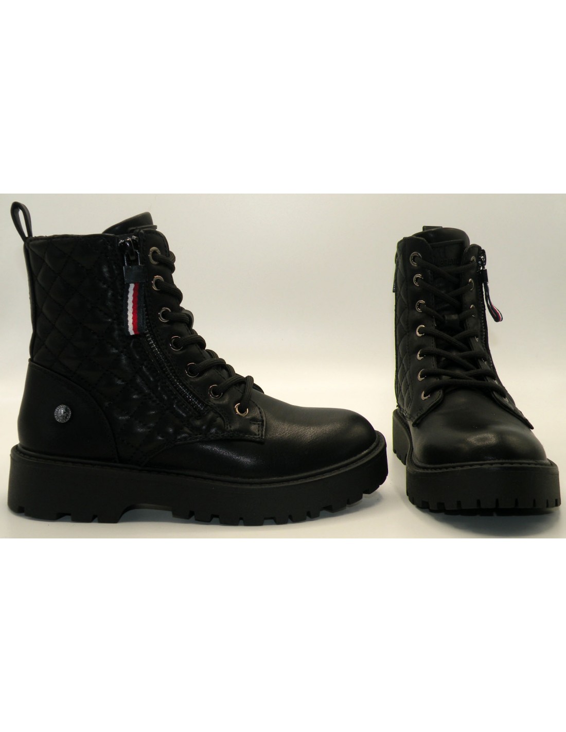 Botin en sintético de color negro con caña acolchada de rombos, con cordones y 2 cremalleras, una de adorno y otra para el calce, piso con cuña de 2'5cm de goma antideslizante.