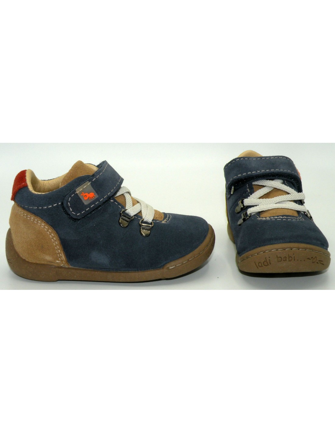 Zapato en piel serraje de color azul, combinado con beige, cordones elásticos y velcro, piso flexible de goma antideslizante.