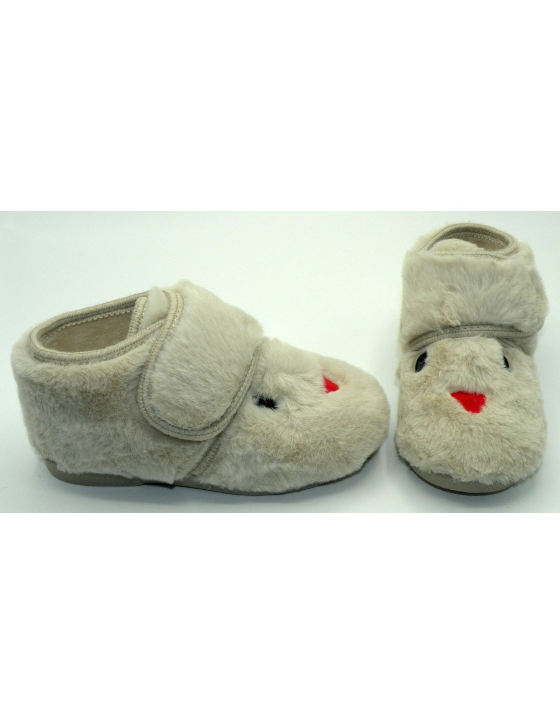 Zapatilla de casa en textil peludito de color beig,con cara de conejito, velcro y piso de goma antideslizante.
