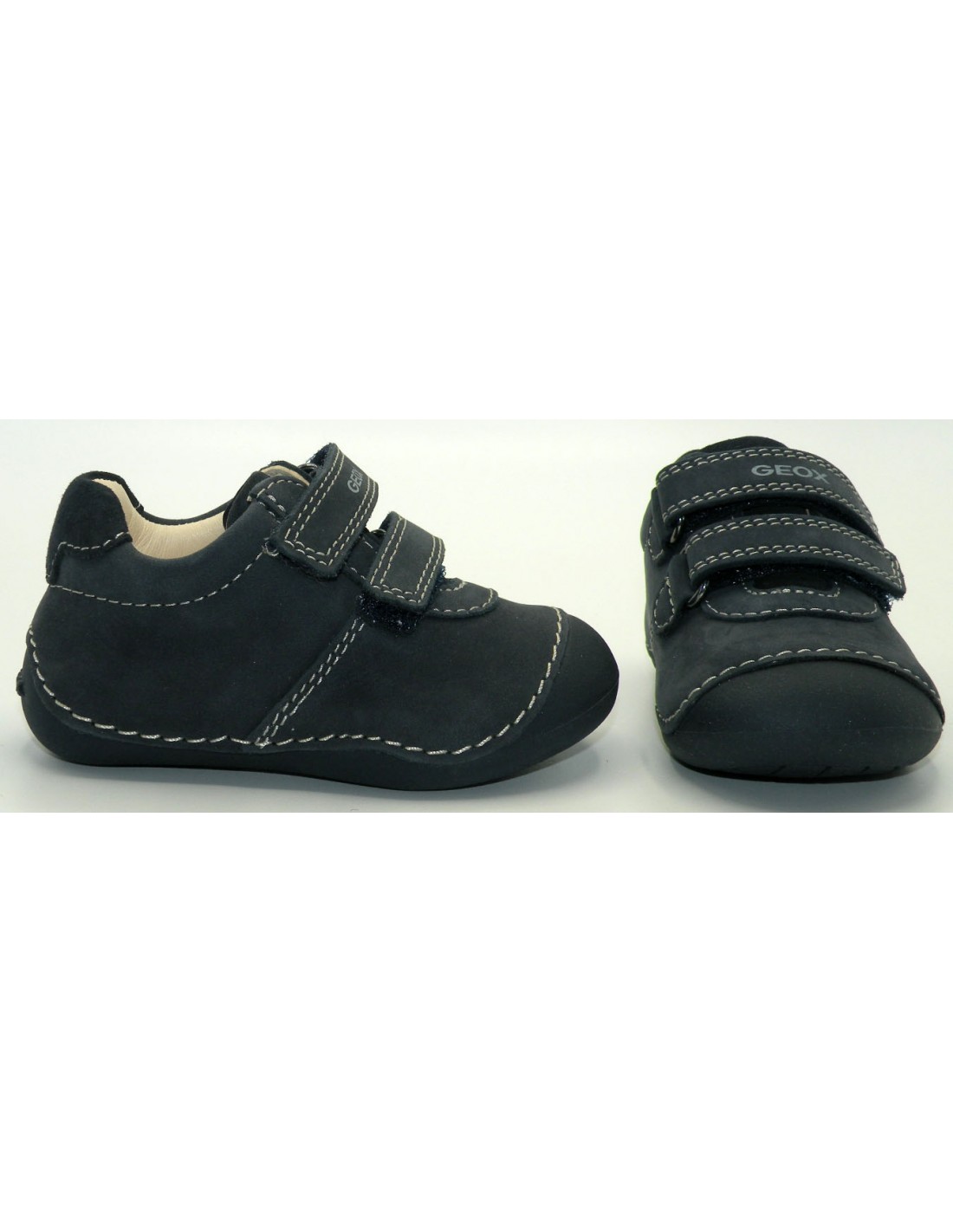 Zapato de primeros pasos en piel nobuck de color marino, velcros, piso flexible y transpirable de goma antideslizante