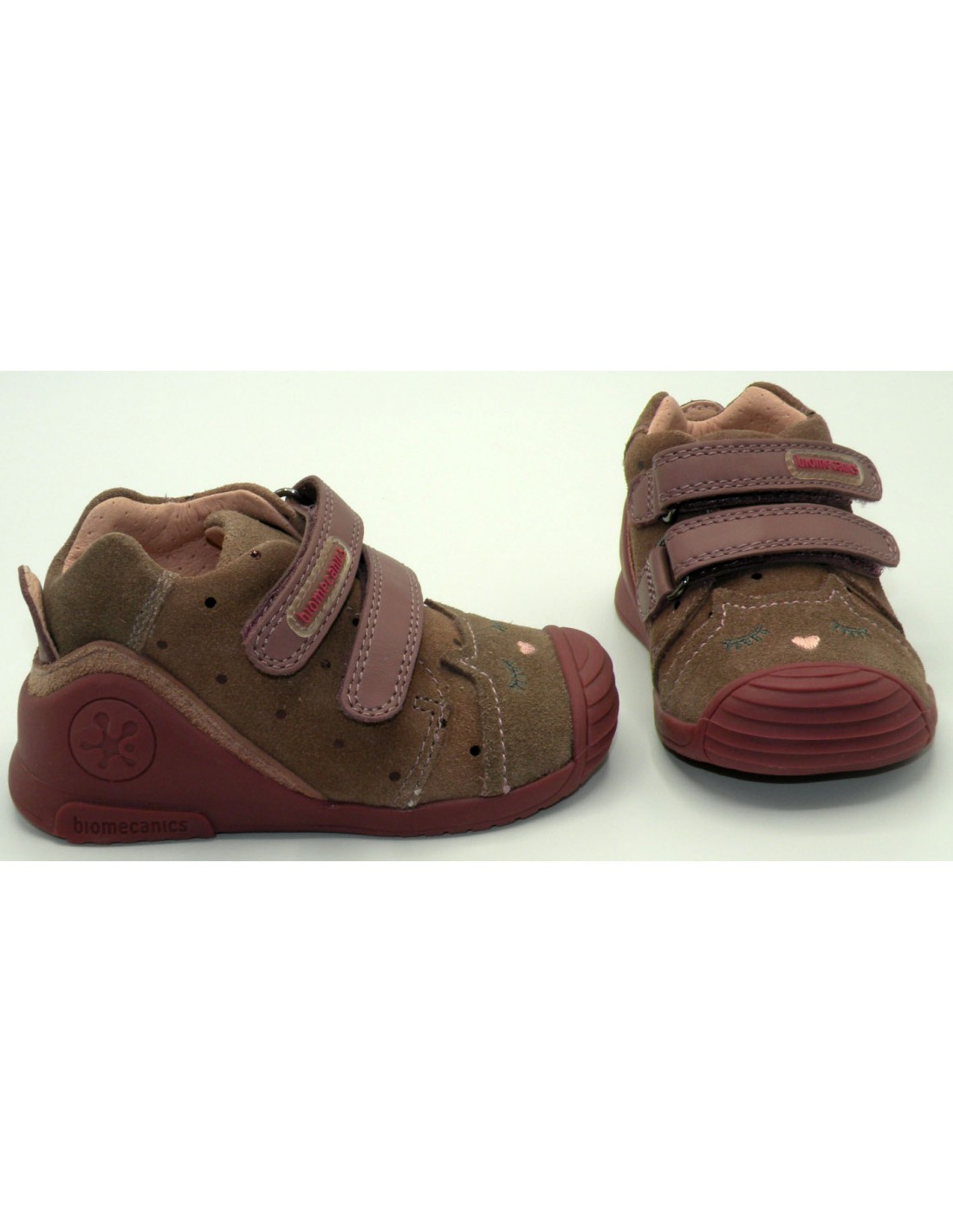 Zapato abotinado en piel de color rosa, 2 velcros y piso de goma antideslizante.