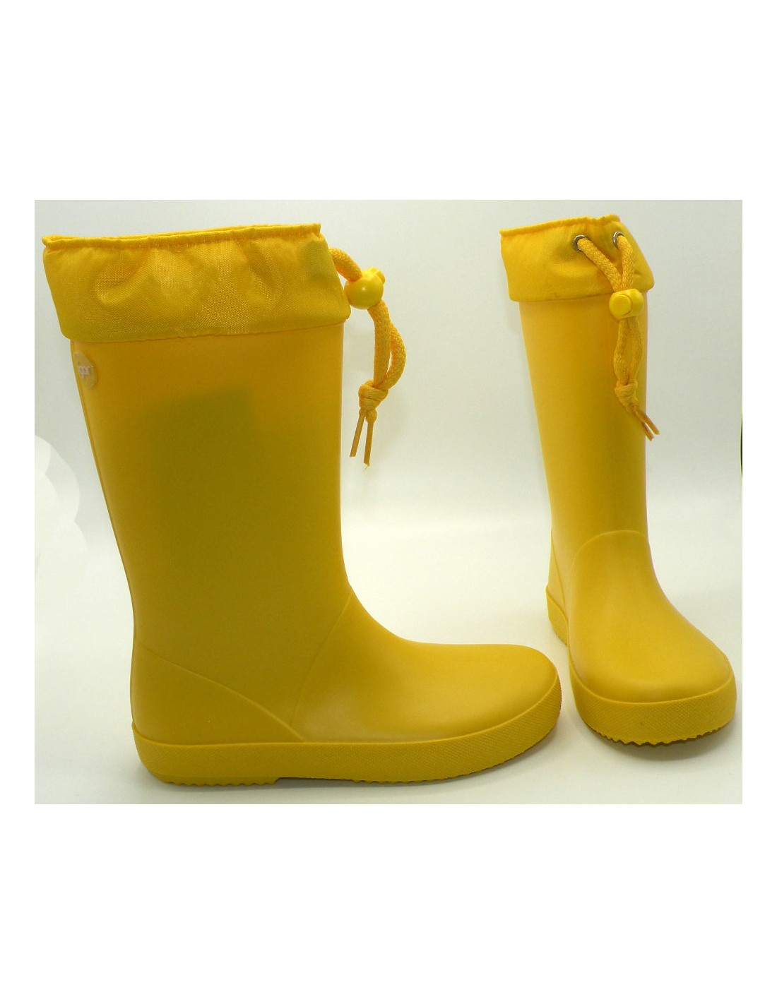 Botas de Agua de goma, de color amarillo, con cierre de collarin ajustable, plantilla interior y suela antideslizante.
