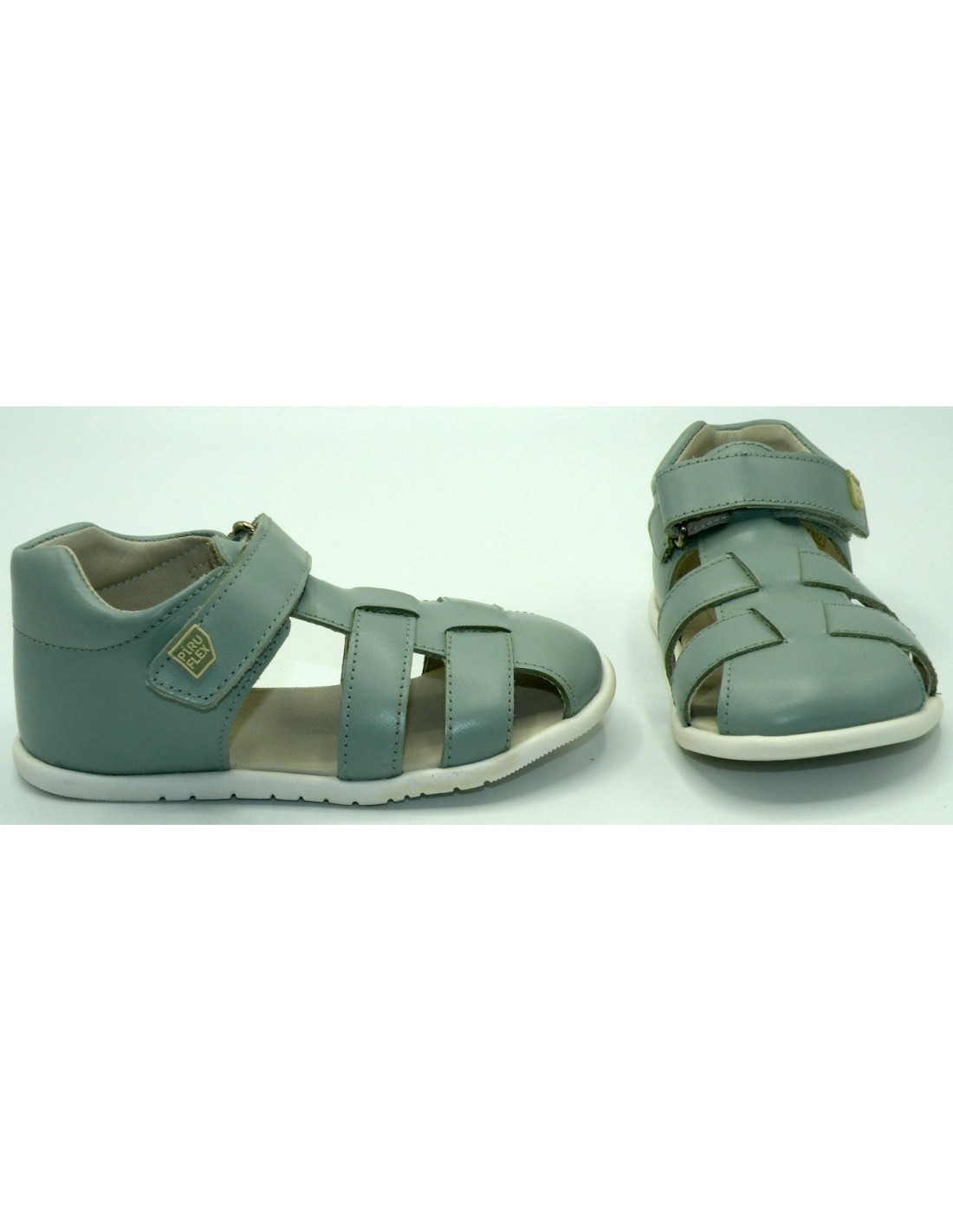 Sandalia respetuosa de piel en color verde ,puntera cerrada y velcro, piso fino y flexible en goma antideslizante.