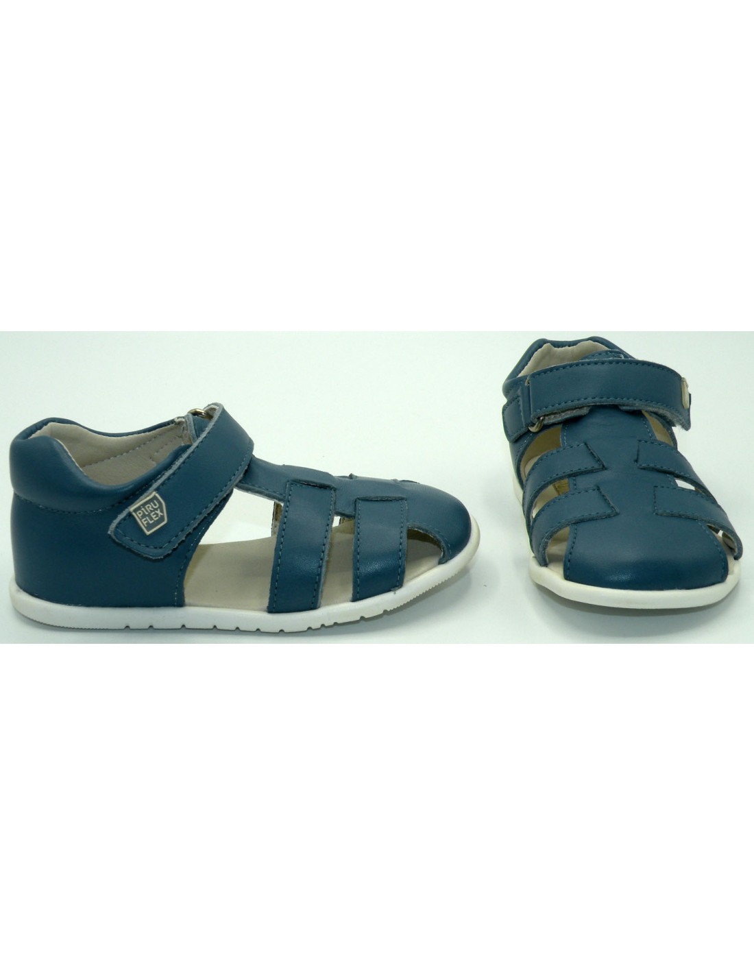 Sandalia respetuosa en piel de color azul, puntera cerrada, velcro, piso fino y flexible de goma antideslizante.