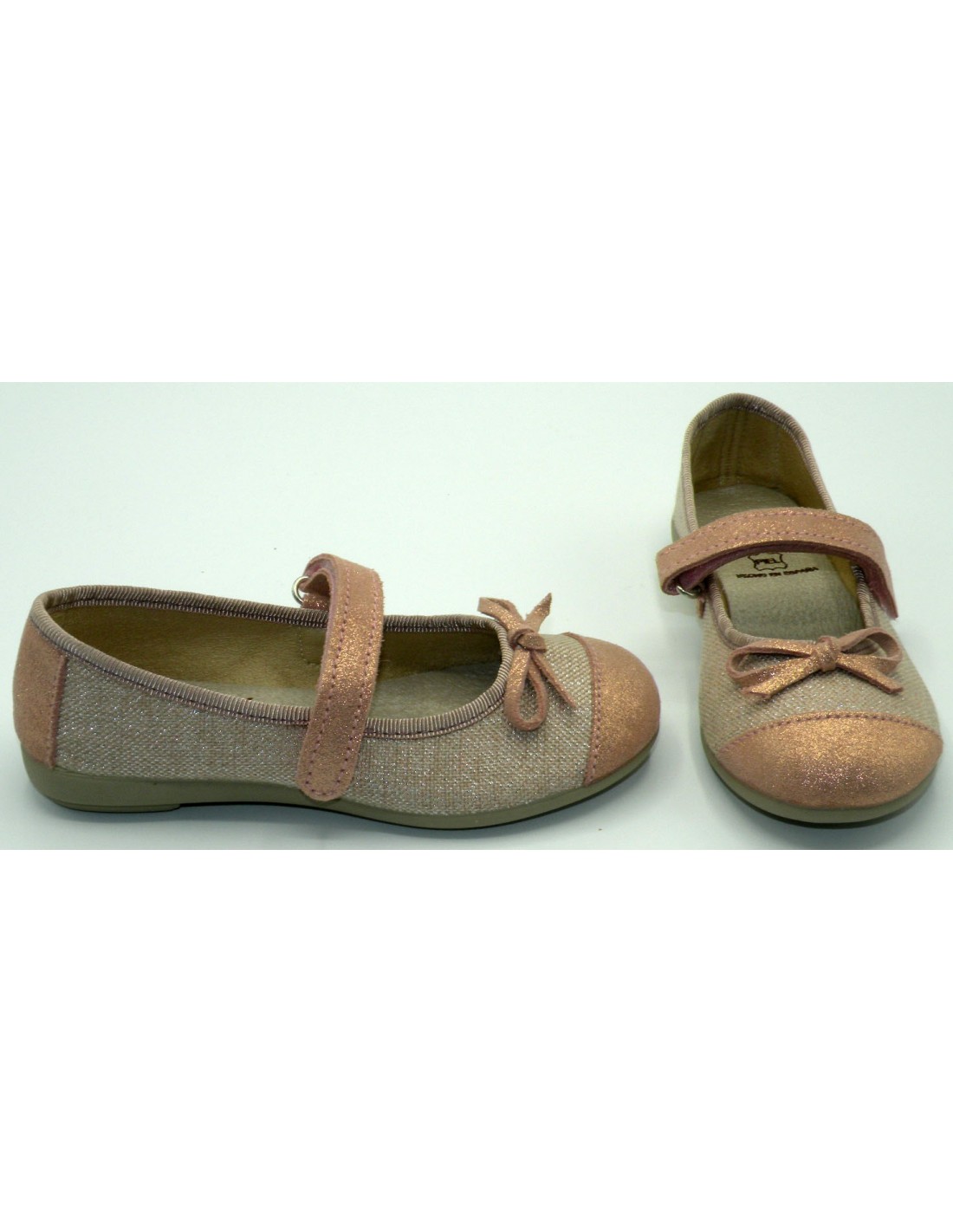 Manoletina en textil laminado nude, velcro y piso de goma antideslizante.
