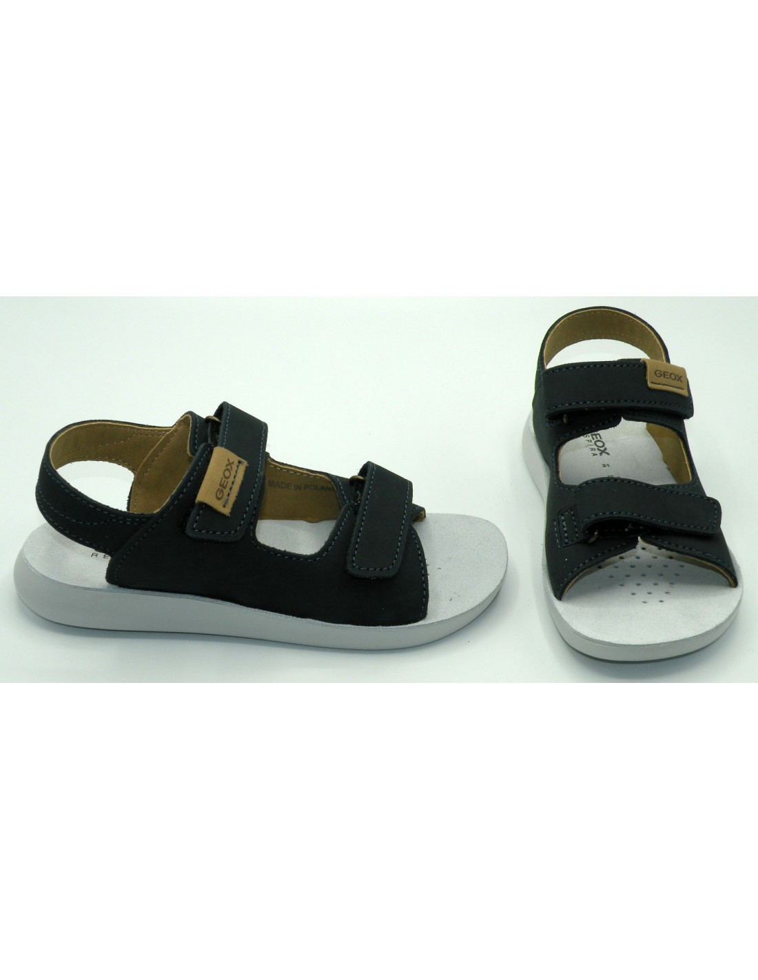 Sandalia de piel en color marino, 2 velcros, piso transpirable de goma antideslizante.