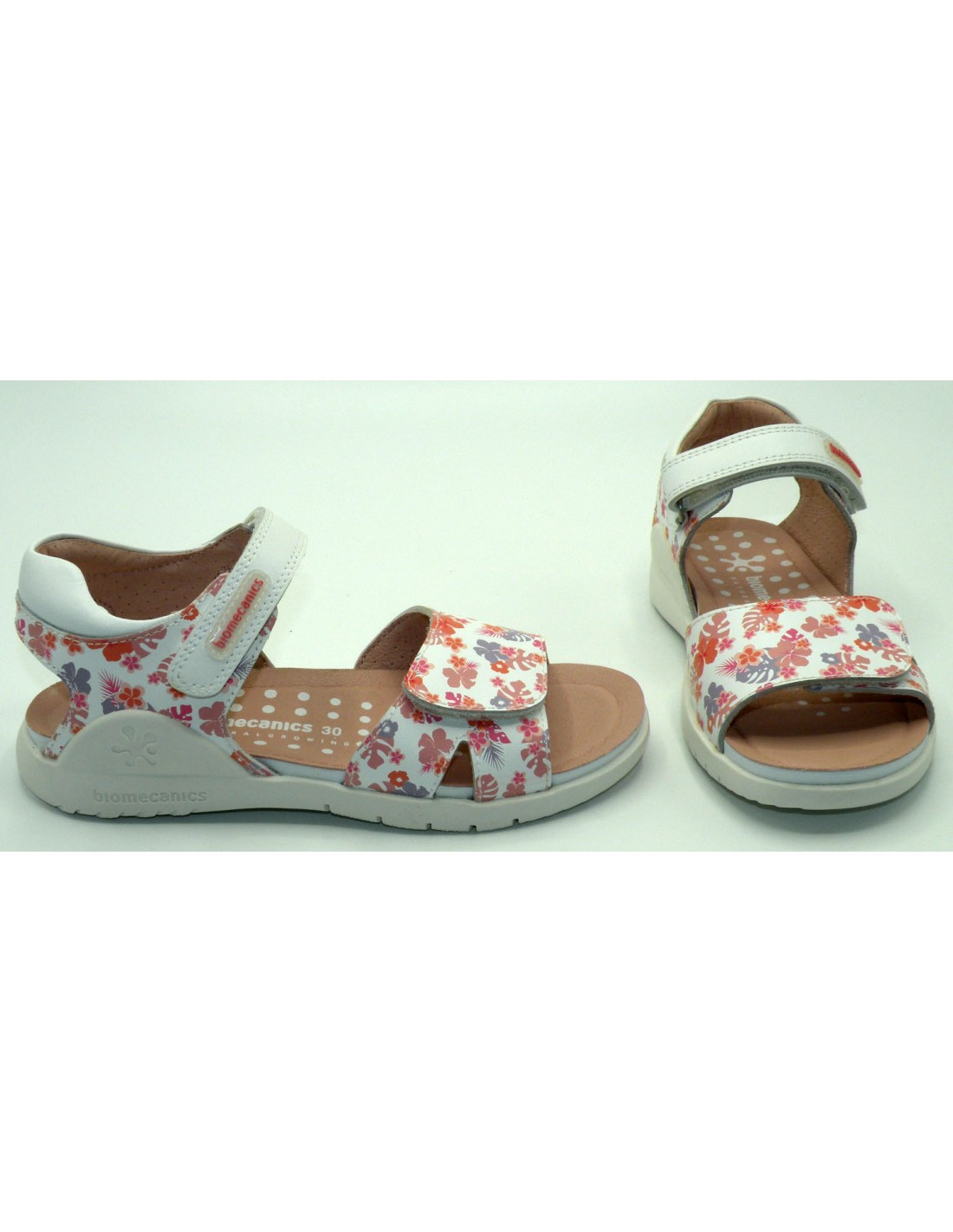 Sandalia de piel en color blanco/rosa, con estampado floral, puntera abierta, velcros y piso flexible de goma antideslizante.
